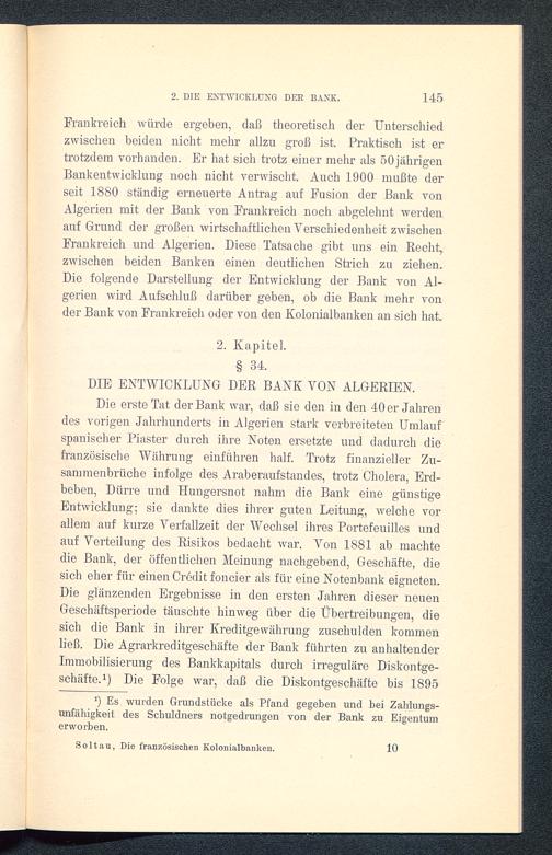 Frankreich würde ergeben, daß theoretisch der Unterschiedzwischen beiden nicht mehr allzu groß ist. Praktisch ist ertrotzdem vorhanden. Er hat sich trotz einer mehr als 50jährigenBankentwicklung noch nicht verwischt. Auch 1900 mußte derseit 1880 ständig erneuerte Antrag auf Fusion der Bank vonAlgerien mit der Bank von Frankreich noch abgelehnt werdenauf Grund der großen wirtschaftlichen Verschiedenheit zwischenFrankreich und Algerien . Diese Tatsache gibt uns ein Recht,zwischen beiden Banken einen deutlichen Strich zu ziehen.Die folgende Darstellung der Entwicklung der Bank von Al-gerien wird Aufschluß darüber geben, ob die Bank mehr vonder Bank von Frankreich oder von den Kolonialbanken an sich hat.