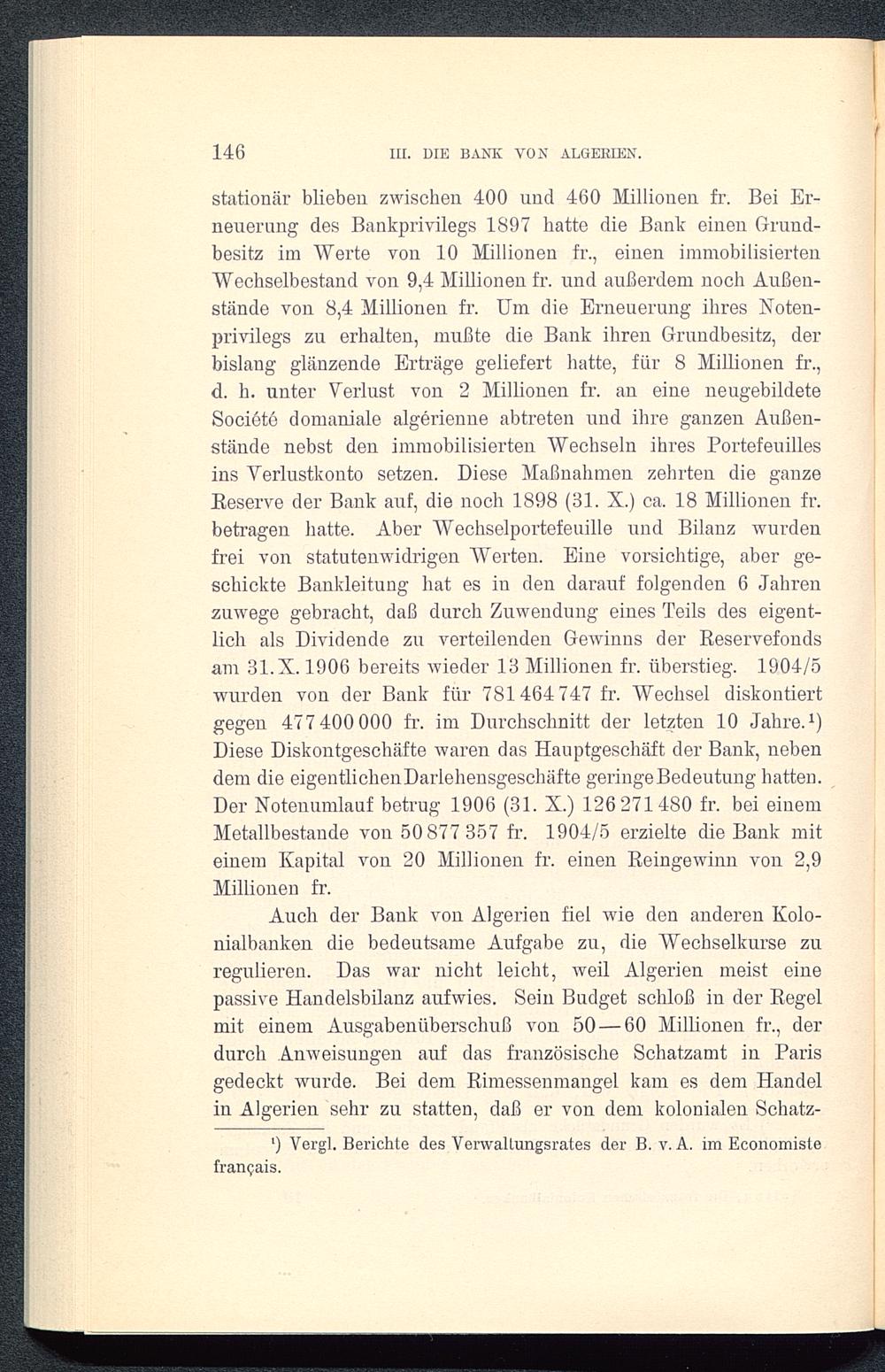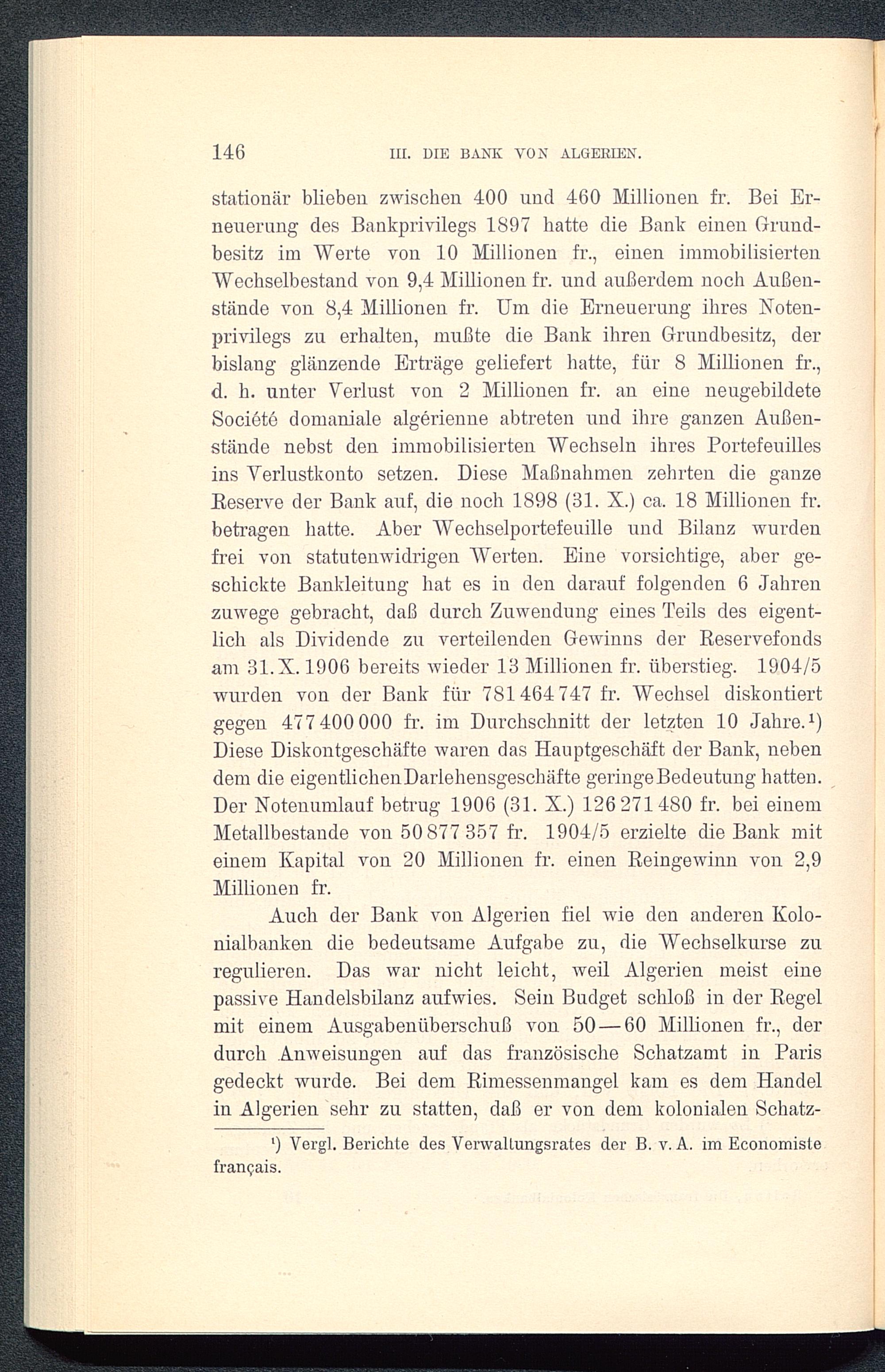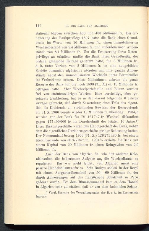 stationär blieben zwischen 400 und 460 Millionen fr. Bei Er-neuerung des Bankprivilegs 1897 hatte die Bank einen Grund-besitz im "Werte von 10 Millionen fr., einen immobilisiertenWechselbestand von 9,4 Millionen fr. und außerdem noch Außen-stände von 8,4 Millionen fr. Um die Erneuerung ihres Noten-privilegs zu erhalten, mußte die Bank ihren Grundbesitz, derbislang glänzende Erträge geliefert hatte, für 8 Millionen fr.,d. h. unter Verlust von 2 Millionen fr. an eine neugebildeteSociete domaniale algerienne abtreten und ihre ganzen Außen-stände nebst den immobilisierten Wechseln ihres Portefeuillesins Verlustkonto setzen. Diese Maßnahmen zehrten die ganzeBeserve der Bank auf, die noch 1898 (31. X.) ca. 18 Millionen fr.betragen hatte. Aber Wechselportefeuille und Bilanz wurdenfrei von statutenwidrigen Werten. Eine vorsichtige, aber ge-schickte Bankleitung hat es in den darauf folgenden 6 Jahrenzuwege gebracht, daß durch Zuwendung eines Teils des eigent-lich als Dividende zu verteilenden Gewinns der Reservefondsam 31.X. 1906 bereits wieder 13 Millionen fr. überstieg. 1904/5wurden von der Bank für 781464 747 fr. Wechsel diskontiertgegen 477 400 000 fr. im Durchschnitt der letzten 10 Jahre. 1 )Diese Diskontgeschäfte waren das Hauptgeschäft der Bank, nebendem die eigentlichenDarlehensgeschäfte geringe Bedeutung hatten.Der Notenumlauf betrug 1906 (31. X.) 126 271480 fr. bei einemMetallbestande von 50 877 357 fr. 1904/5 erzielte die Bank miteinem Kapital von 20 Millionen fr. einen Beingewinn von 2,9Millionen fr.