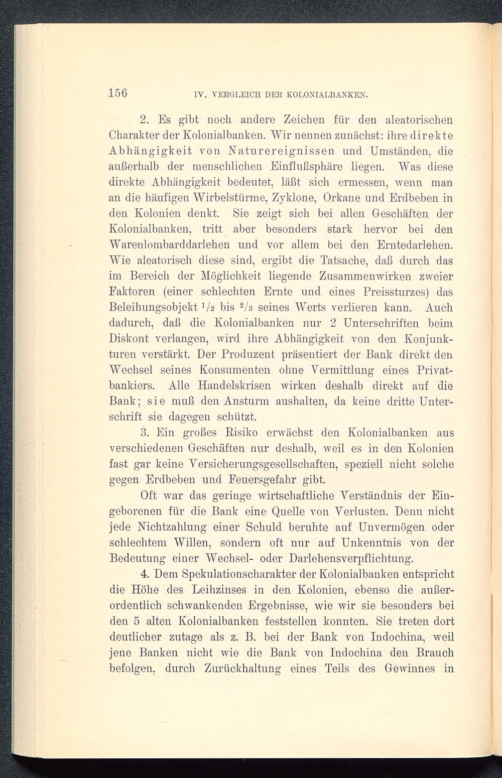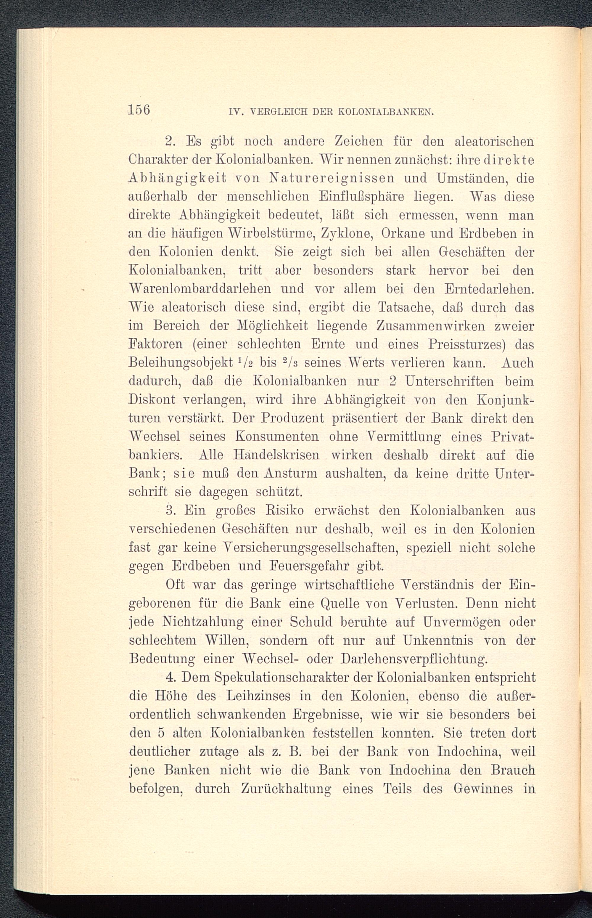3. Ein großes Risiko erwächst den Kolonialbanken ausverschiedenen Geschäften nur deshalb, weil es in den Kolonienfast gar keine Versicherungsgesellschaften, speziell nicht solchegegen Erdbeben und Feuersgefahr gibt.