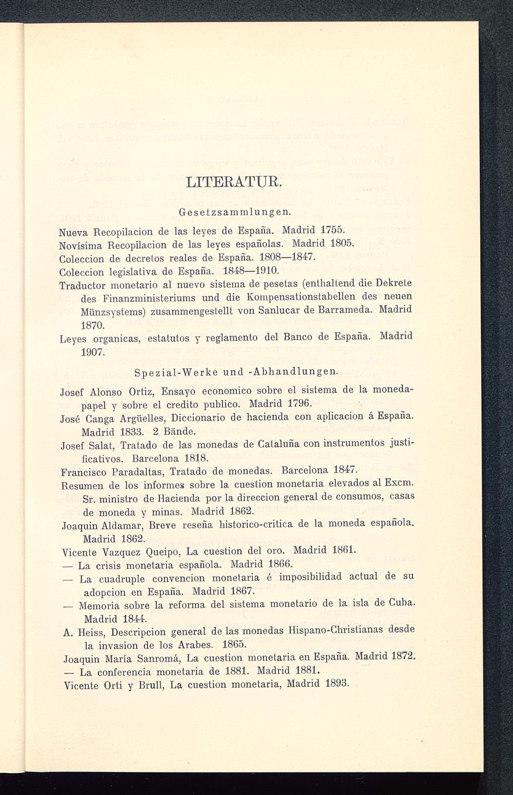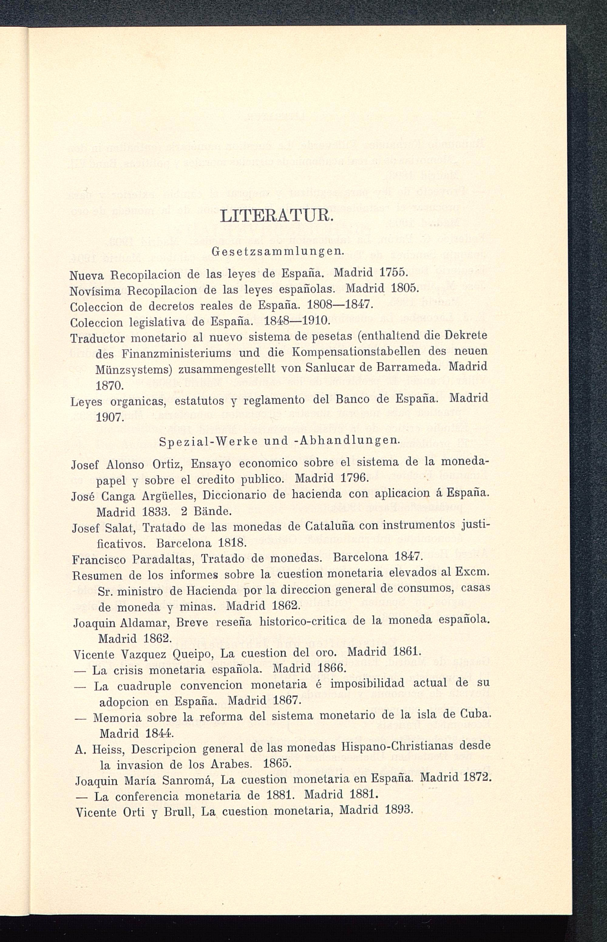 Nueva Recopilacion de las leyes de España. Madrid 1755.Novísima Recopilacion de las leyes españolas. Madrid 1805.Coleccion de decretos reales de España . 1808-1847.
