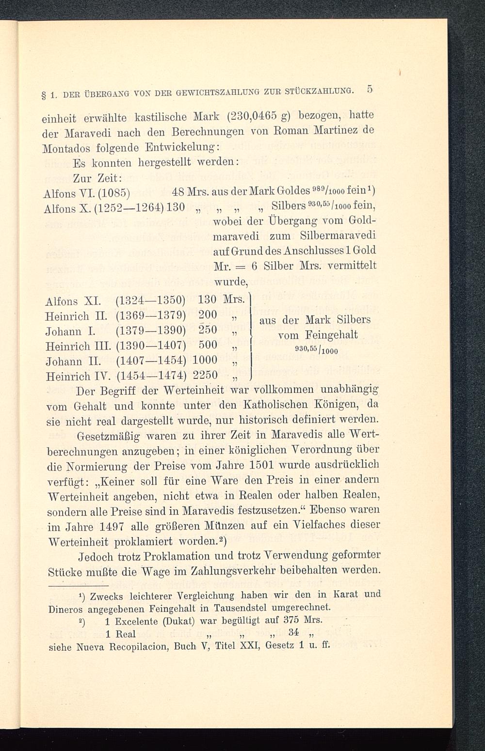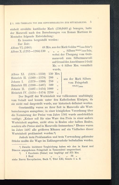 Der Begriff der Werteinheit war vollkommen unabhängigvom Gehalt und konnte unter den Katholischen Königen, dasie nicht real dargestellt wurde, nur historisch definiert werden.Gesetzmäßig waren zu ihrer Zeit in Maravedis alle Wert-berechnungen anzugeben; in einer königlichen Verordnung überdie Normierung der Preise vom Jahre 1501 wurde ausdrücklichverfügt:„ Keiner soll für eine Ware den Preis in einer andernWerteinheit angeben, nicht etwa in Realen oder halben Realen,sondern alle Preise sind in Maravedis festzusetzen." Ebenso waren.im Jahre 1497 alle größeren Münzen auf ein Vielfaches dieserWerteinheit proklamiert worden. 2)