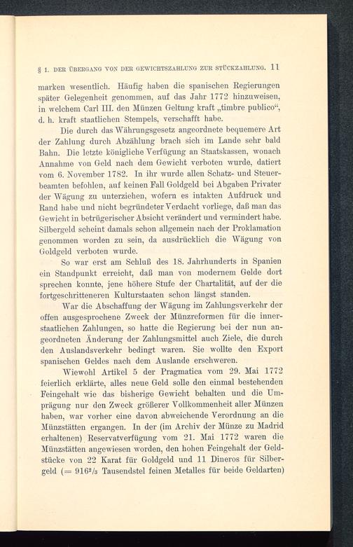Wiewohl Artikel 5 der Pragmatica vom 29. Mai 1772feierlich erklärte, alles neue Geld solle den einmal bestehendenFeingehalt wie das bisherige Gewicht behalten und die Um-prägung nur den Zweck größerer Vollkommenheit aller Münzenhaben, war vorher eine davon abweichende Verordnung an dieMünzstätten ergangen. In der( im Archiv der Münze zu Madriderhaltenen) Reservatverfügung vom 21. Mai 1772 waren dieMünzstätten angewiesen worden, den hohen Feingehalt der Geld-stücke von 22 Karat für Goldgeld und 11 Dineros für Silber-geld( 9162/3 Tausendstel feinen Metalles für beide Geldarten)