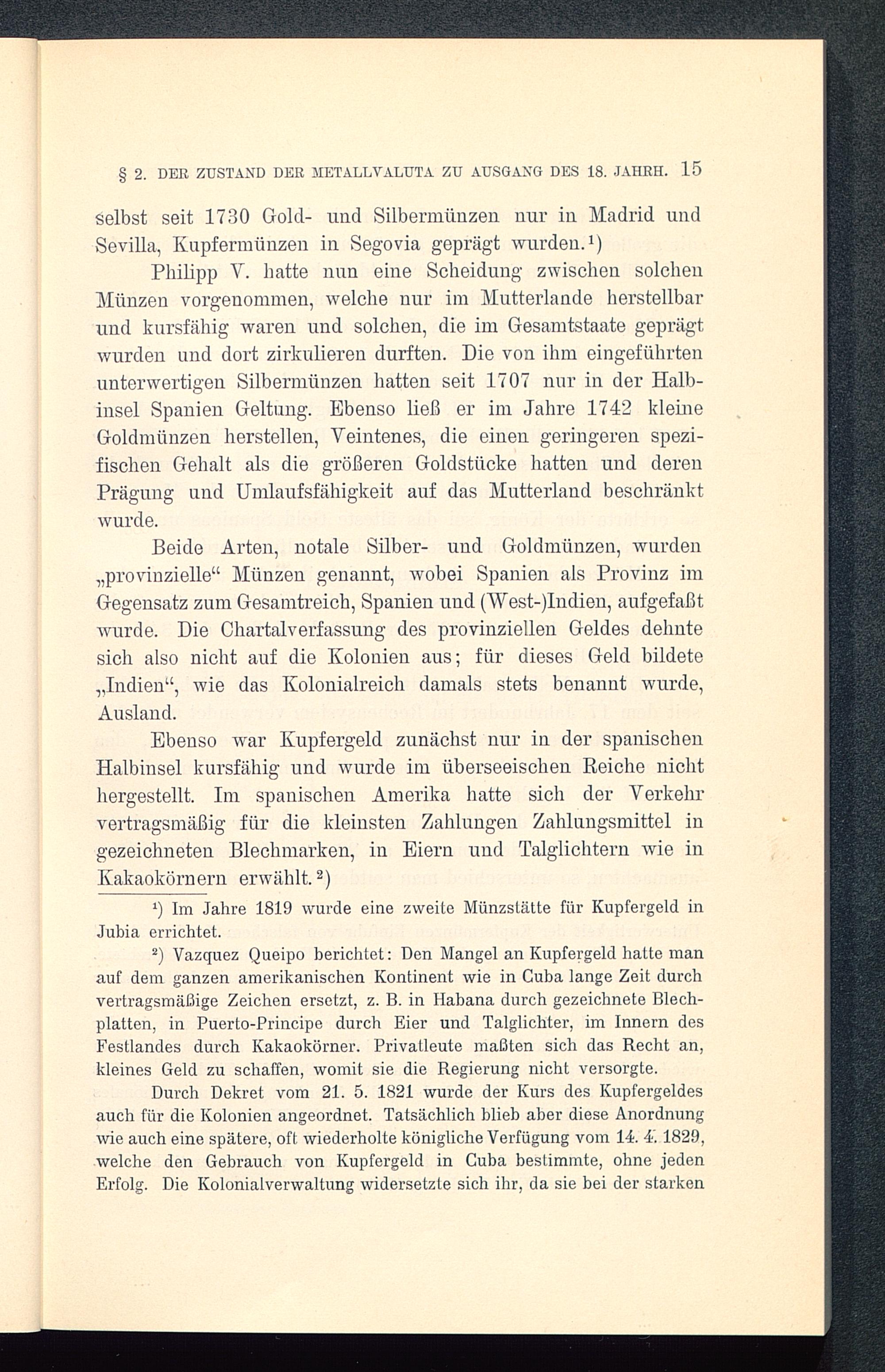 Beide Arten, notale Silber- und Goldmünzen, wurden." provinzielle" Münzen genannt, wobei Spanien als Provinz imGegensatz zum Gesamtreich, Spanien und ( West-) Indien, aufgefaßtwurde. Die Chartalverfassung des provinziellen Geldes dehntesich also nicht auf die Kolonien aus; für dieses Geld bildete,, Indien", wie das Kolonialreich damals stets benannt wurde,Ausland.