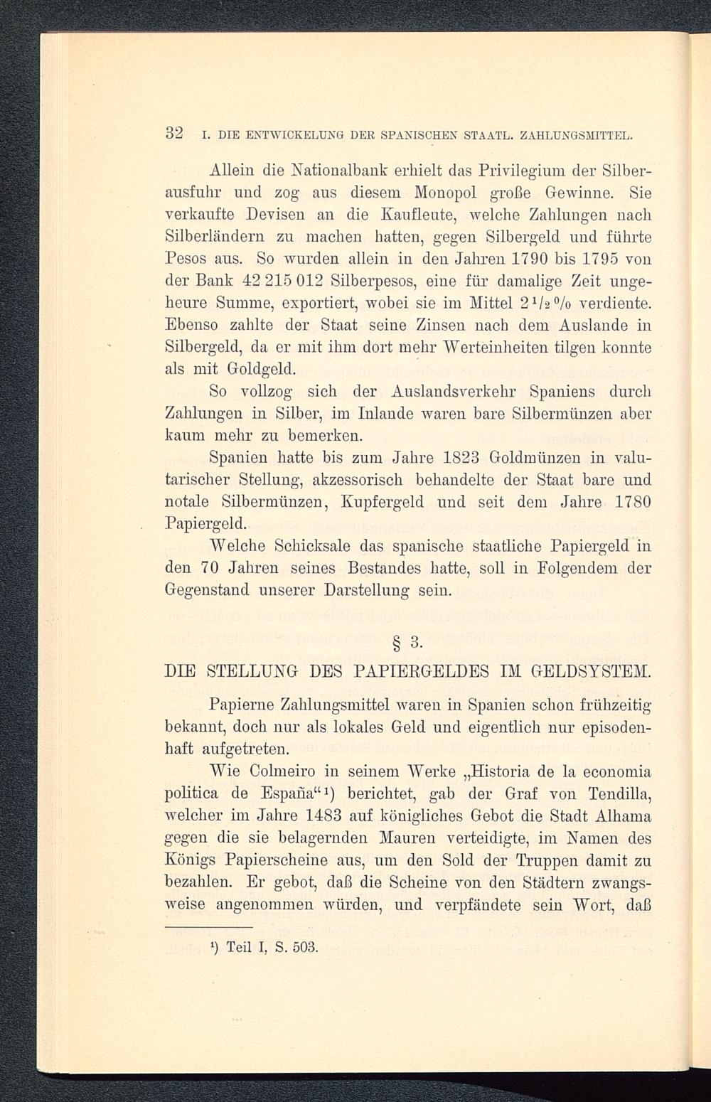 Wie Colmeiro in seinem Werke ,, Historia de la economiapolitica de España" 1) berichtet, gab der Graf von Tendilla,welcher im Jahre 1483 auf königliches Gebot die Stadt Alhamagegen die sie belagernden Mauren verteidigte, im Namen desKönigs Papierscheine aus, um den Sold der Truppen damit zubezahlen. Er gebot, daß die Scheine von den Städtern zwangs-weise angenommen würden, und verpfändete sein Wort, daß