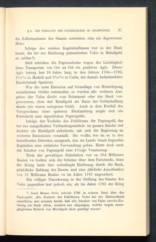 1) Josef Monso Ortiz schrieb 1796 in seinem Buch über dasPapiergeld:„ Die Freiheit des Publikums, Vales bei der Nationalbankeinzulösen, war niemals Anlaß, daß alle Inhaber von Vales zwecks Ein-lösung zur Bank eilten, sondern nur diejenigen, welche wegen unum-gänglichen Bedarfs von Metallgeld dazu genötigt waren".