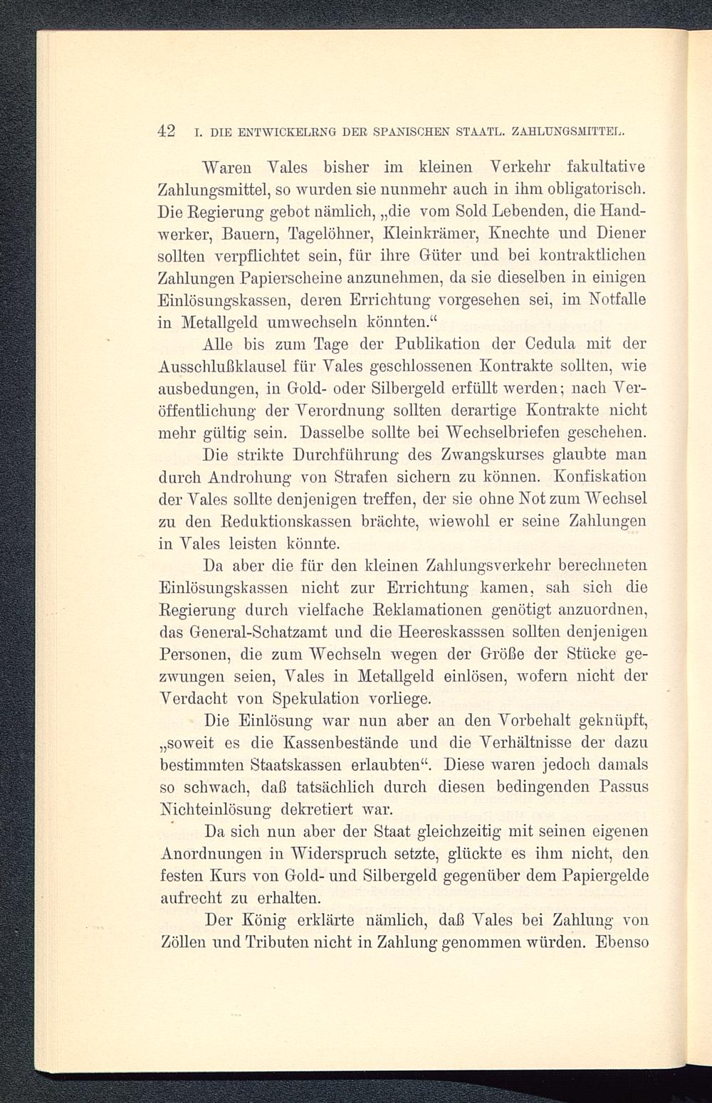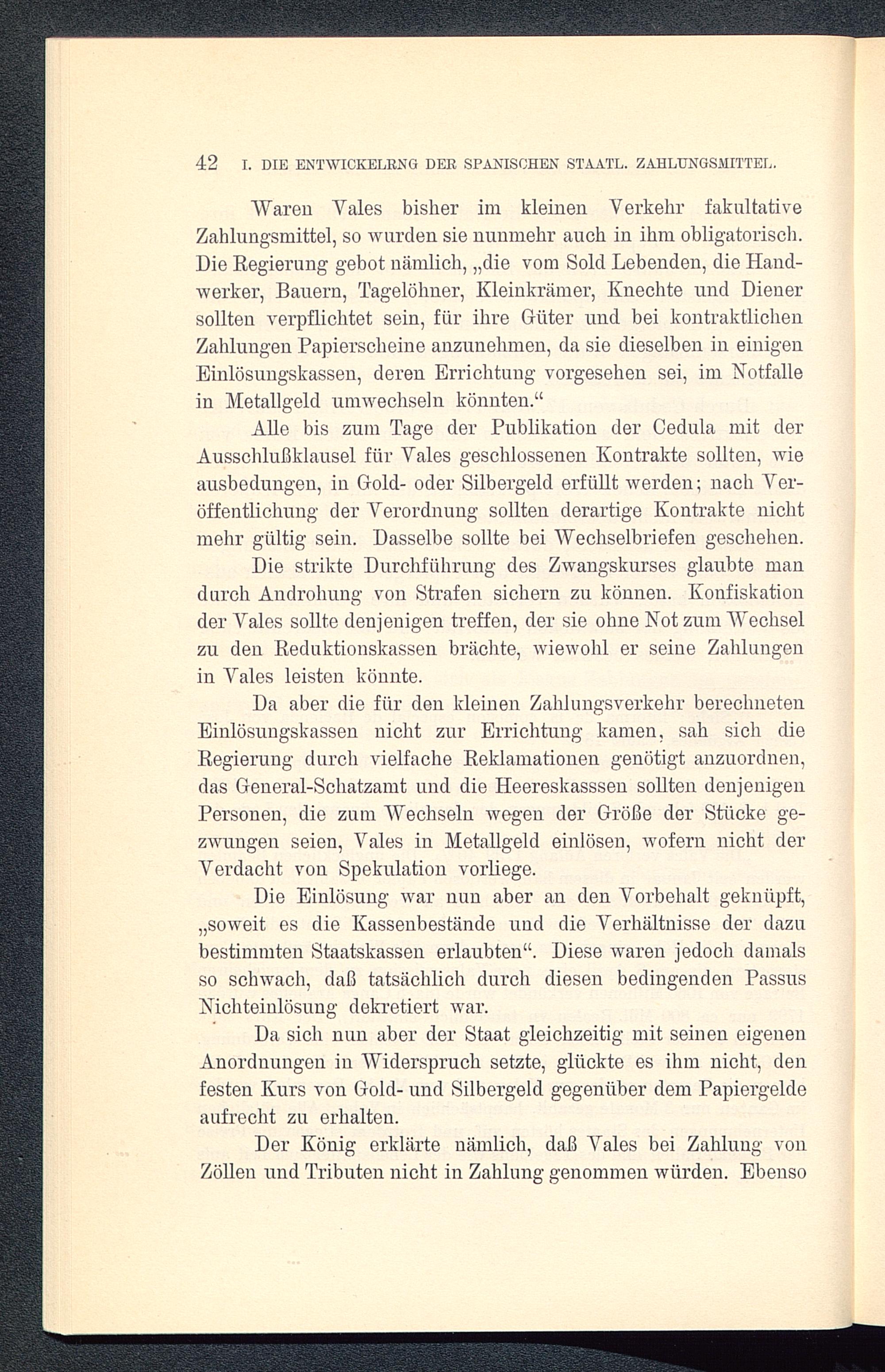 Die strikte Durchführung des Zwangskurses glaubte mandurch Androhung von Strafen sichern zu können. Konfiskation.der Vales sollte denjenigen treffen, der sie ohne Not zum Wechselzu den Reduktionskassen brächte, wiewohl er seine Zahlungenin Vales leisten könnte.