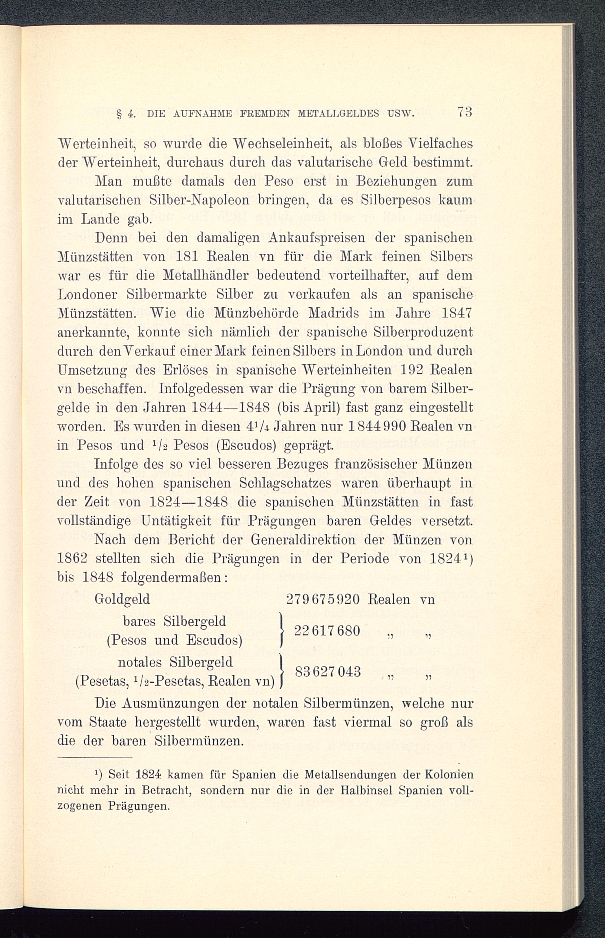 Infolge des so viel besseren Bezuges französischer Münzenund des hohen spanischen Schlagschatzes waren überhaupt inder Zeit von 1824-1848 die spanischen Münzstätten in fastvollständige Untätigkeit für Prägungen baren Geldes versetzt.Nach dem Bericht der Generaldirektion der Münzen von1862 stellten sich die Prägungen in der Periode von 18241)bis 1848 folgendermaßen: