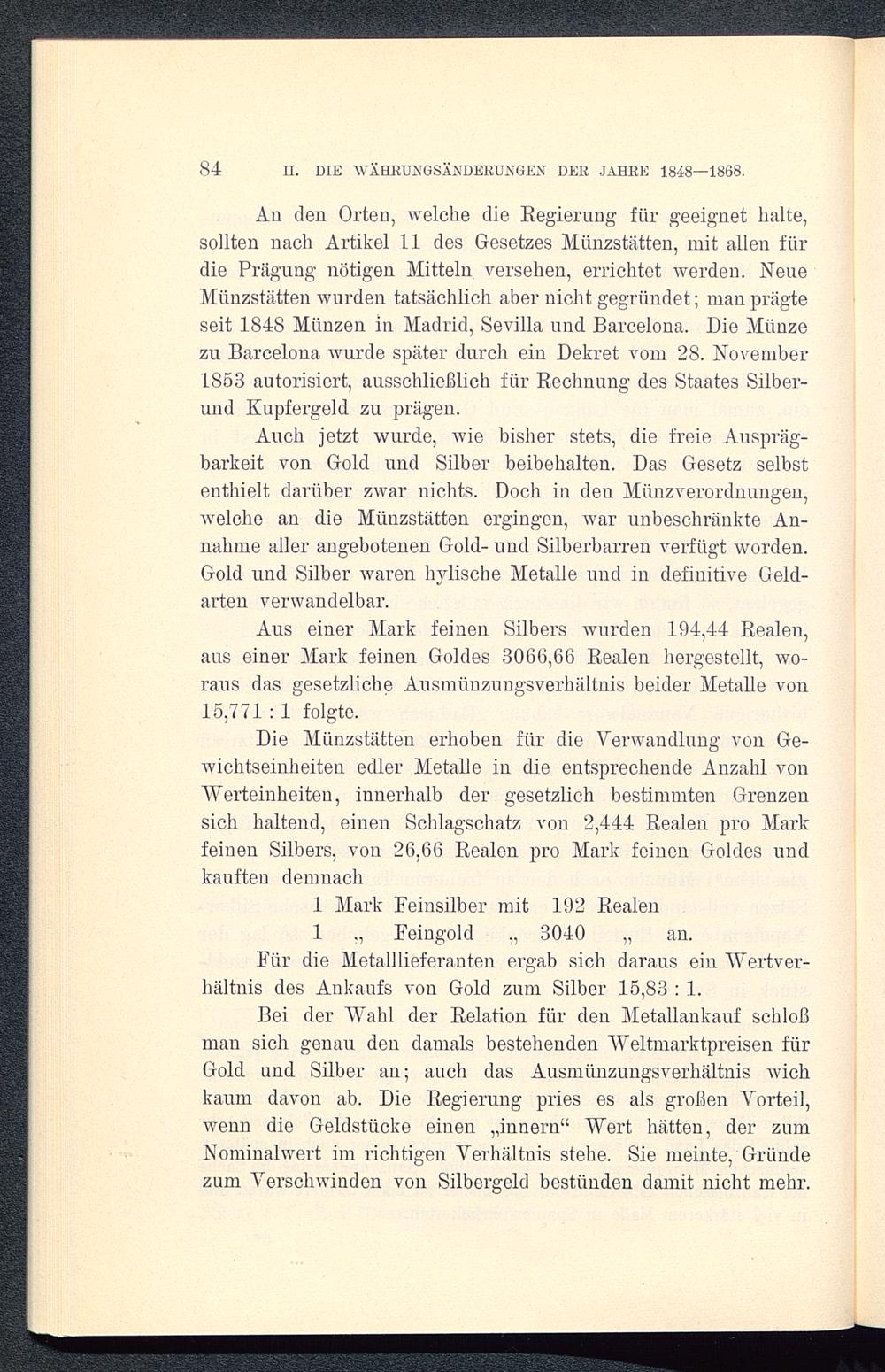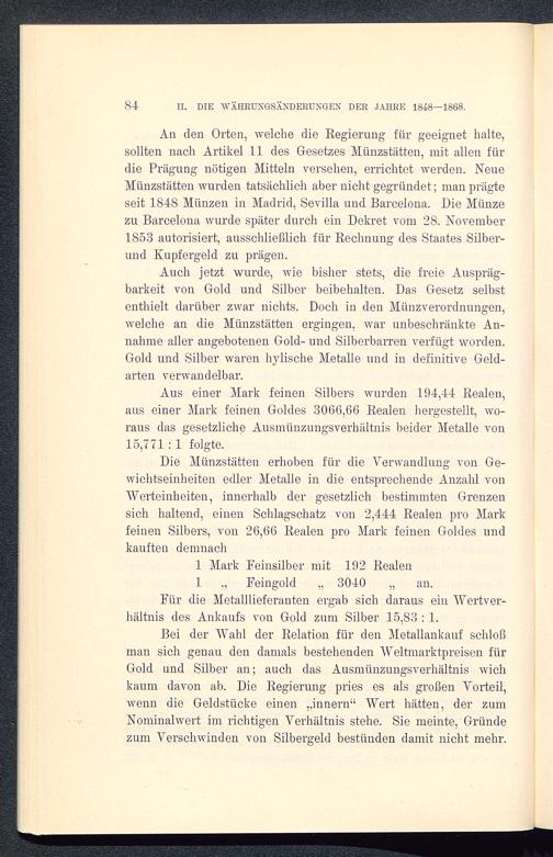 Bei der Wahl der Relation für den Metallankauf schloßman sich genau den damals bestehenden Weltmarktpreisen fürGold und Silber an; auch das Ausmünzungsverhältnis wichkaum davon ab. Die Regierung pries es als großen Vorteil,wenn die Geldstücke einen innern" Wert hätten, der zumNominalwert im richtigen Verhältnis stehe. Sie meinte, Gründezum Verschwinden von Silbergeld bestünden damit nicht mehr.