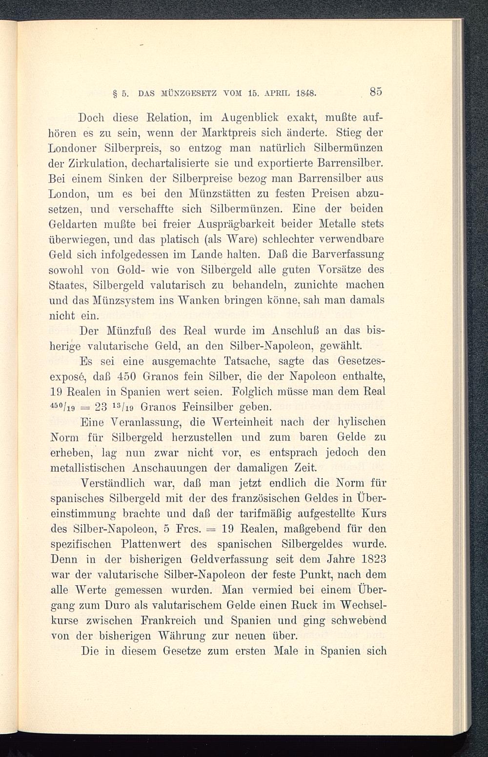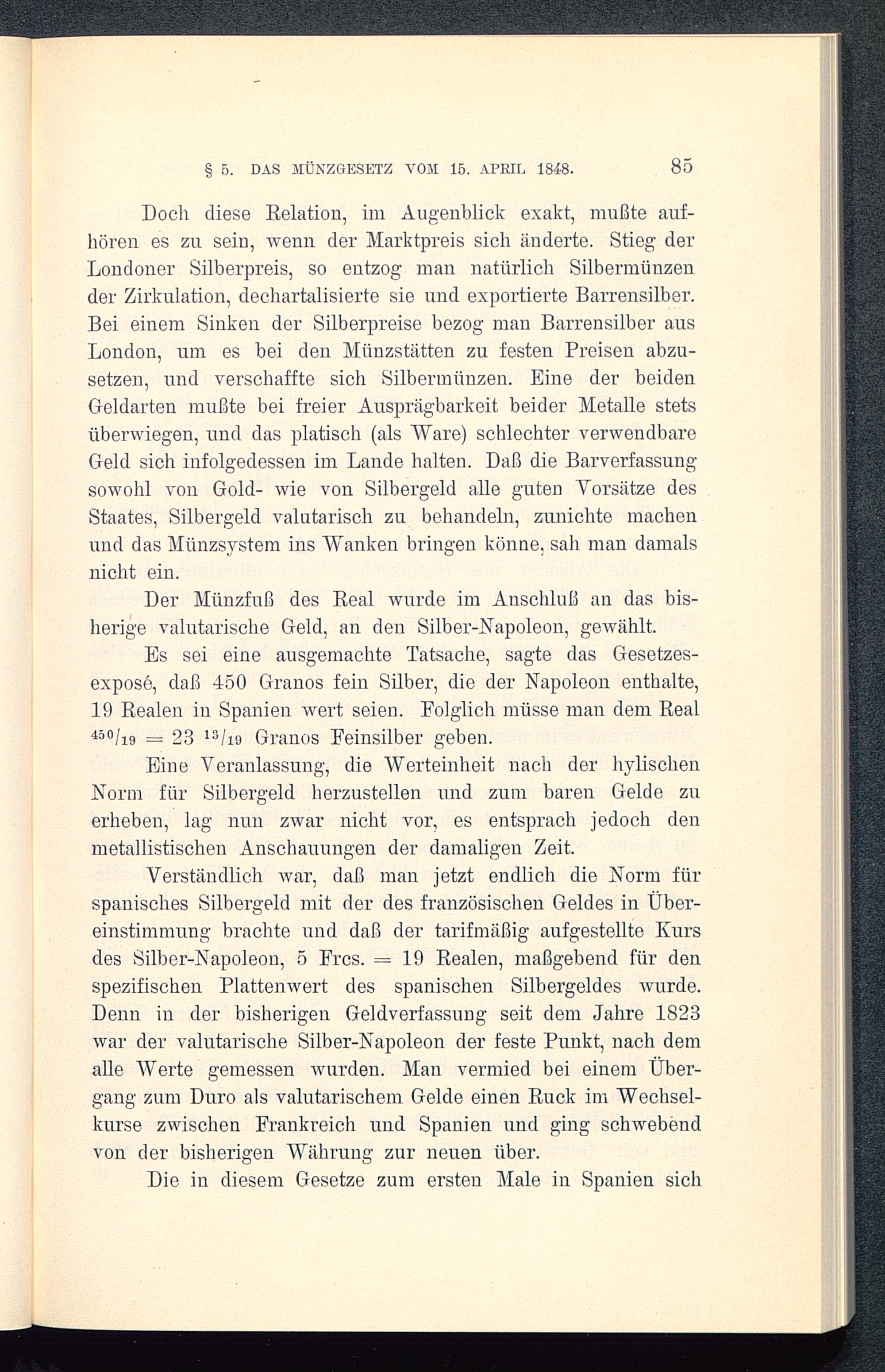 Es sei eine ausgemachte Tatsache, sagte das Gesetzes-exposé, daß 450 Granos fein Silber, die der Napoleon enthalte,19 Realen in Spanien wert seien. Folglich müsse man dem Real450/1923 13/19 Granos Feinsilber geben.