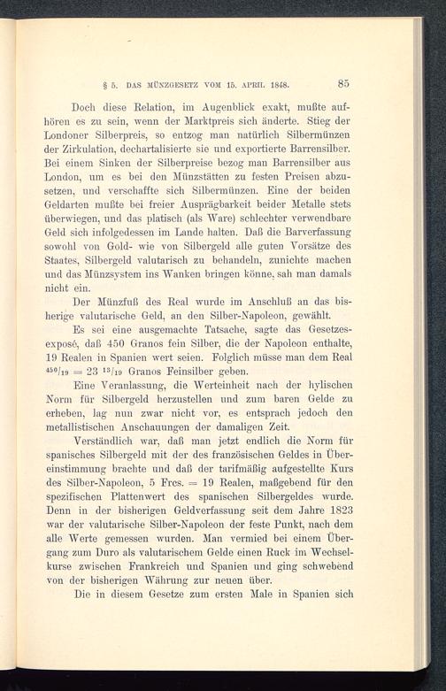 Verständlich war, daß man jetzt endlich die Norm fürspanisches Silbergeld mit der des französischen Geldes in Über-einstimmung brachte und daß der tarifmäßig aufgestellte Kursdes Silber- Napoleon, 5 Frcs. 19 Realen, maßgebend für denspezifischen Plattenwert des spanischen Silbergeldes wurde. Denn in der bisherigen Geldverfassung seit dem Jahre 1823war der valutarische Silber- Napoleon der feste Punkt, nach demalle Werte gemessen wurden. Man vermied bei einem Über-gang zum Duro als valutarischem Gelde einen Ruck im Wechsel-kurse zwischen Frankreich und Spanien und ging schwebend von der bisherigen Währung zur neuen über.