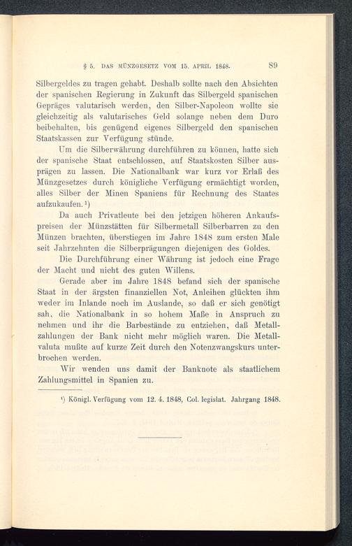 Um die Silberwährung durchführen zu können, hatte sichder spanische Staat entschlossen, auf Staatskosten Silber aus-prägen zu lassen. Die Nationalbank war kurz vor Erlaß desMünzgesetzes durch königliche Verfügung ermächtigt worden,alles Silber der Minen Spaniens für Rechnung des Staatesaufzukaufen. 1)