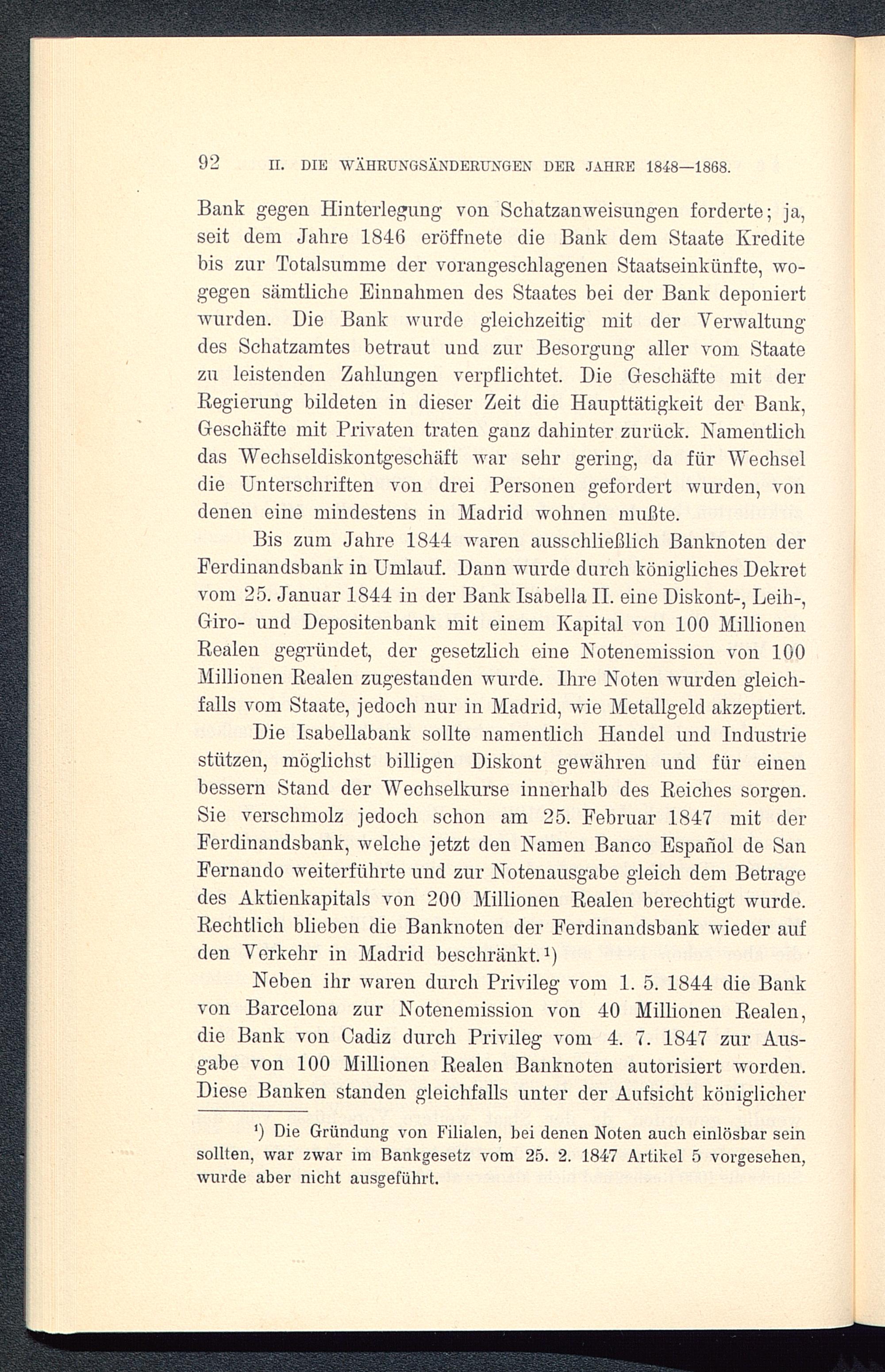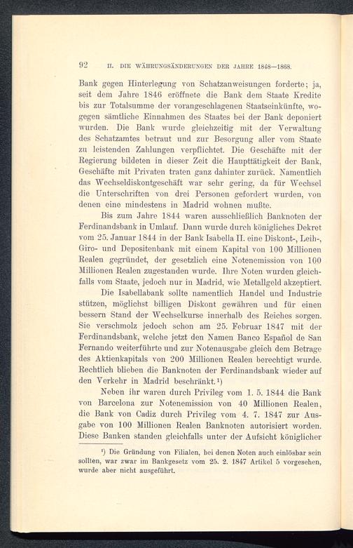 Bis zum Jahre 1844 waren ausschließlich Banknoten derFerdinandsbank in Umlauf. Dann wurde durch königliches Dekretvom 25. Januar 1844 in der Bank Isabella II. eine Diskont-, Leih-,Giro- und Depositenbank mit einem Kapital von 100 MillionenRealen gegründet, der gesetzlich eine Notenemission von 100Millionen Realen zugestanden wurde. Ihre Noten wurden gleich-falls vom Staate, jedoch nur in Madrid , wie Metallgeld akzeptiert.