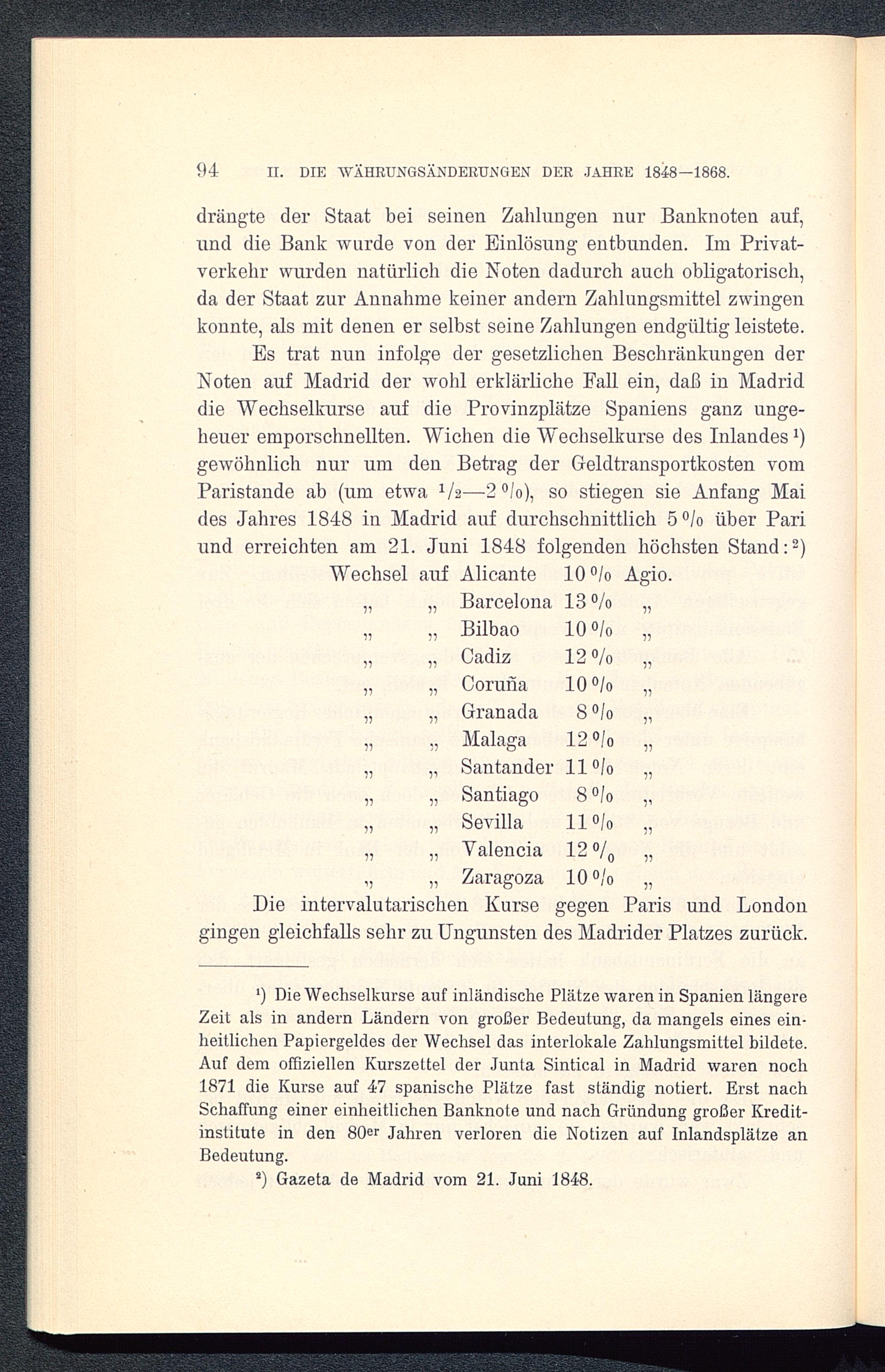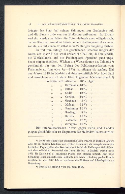 drängte der Staat bei seinen Zahlungen nur Banknoten auf,und die Bank wurde von der Einlösung entbunden. Im Privat-verkehr wurden natürlich die Noten dadurch auch obligatorisch,da der Staat zur Annahme keiner andern Zahlungsmittel zwingen.konnte, als mit denen er selbst seine Zahlungen endgültig leistete.Es trat nun infolge der gesetzlichen Beschränkungen derNoten auf Madrid der wohl erklärliche Fall ein, daß in Madrid die Wechselkurse auf die Provinzplätze Spaniens ganz unge-heuer emporschnellten. Wichen die Wechselkurse des Inlandes ¹)gewöhnlich nur um den Betrag der Geldtransportkosten vomParistande ab( um etwa 1/ 2-2%), so stiegen sie Anfang Maides Jahres 1848 in Madrid auf durchschnittlich 5% über Pariund erreichten am 21. Juni 1848 folgenden höchsten Stand: 2)Wechsel auf Alicante 10 % Agio.