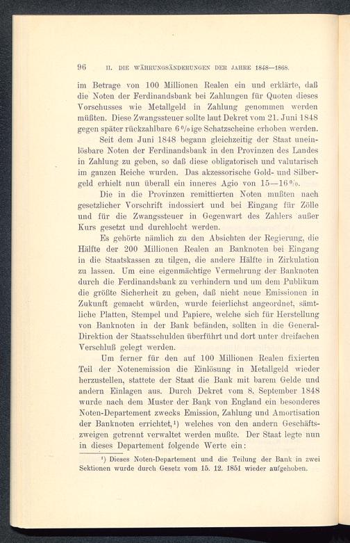 im Betrage von 100 Millionen Realen ein und erklärte, daßdie Noten der Ferdinandsbank bei Zahlungen für Quoten diesesVorschusses wie Metallgeld in Zahlung genommen werdenmüßten. Diese Zwangssteuer sollte laut Dekret vom 21. Juni 1848.gegen später rückzahlbare 6% ige Schatzscheine erhoben werden.Seit dem Juni 1848 begann gleichzeitig der Staat unein-lösbare Noten der Ferdinandsbank in den Provinzen des Landesin Zahlung zu geben, so daß diese obligatorisch und valutarischim ganzen Reiche wurden. Das akzessorische Gold- und Silber-geld erhielt nun überall ein inneres Agio von 15-16%.