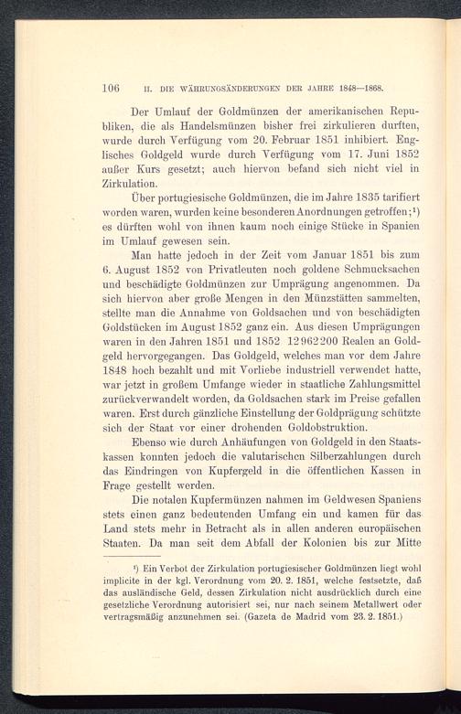 1) Ein Verbot der Zirkulation portugiesischer Goldmünzen liegt wohlimplicite in der kgl. Verordnung vom 20. 2. 1851, welche festsetzte, daßdas ausländische Geld, dessen Zirkulation nicht ausdrücklich durch einegesetzliche Verordnung autorisiert sei, nur nach seinem Metallwert odervertragsmäßig anzunehmen sei.( Gazeta de Madrid vom 23. 2. 1851.)