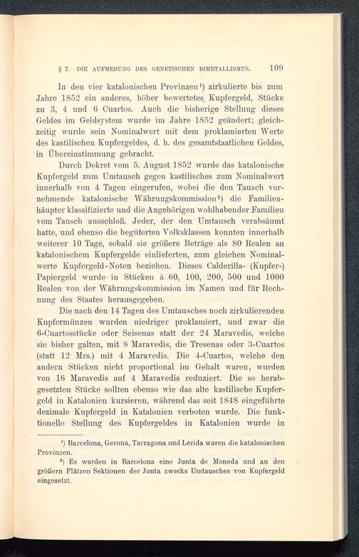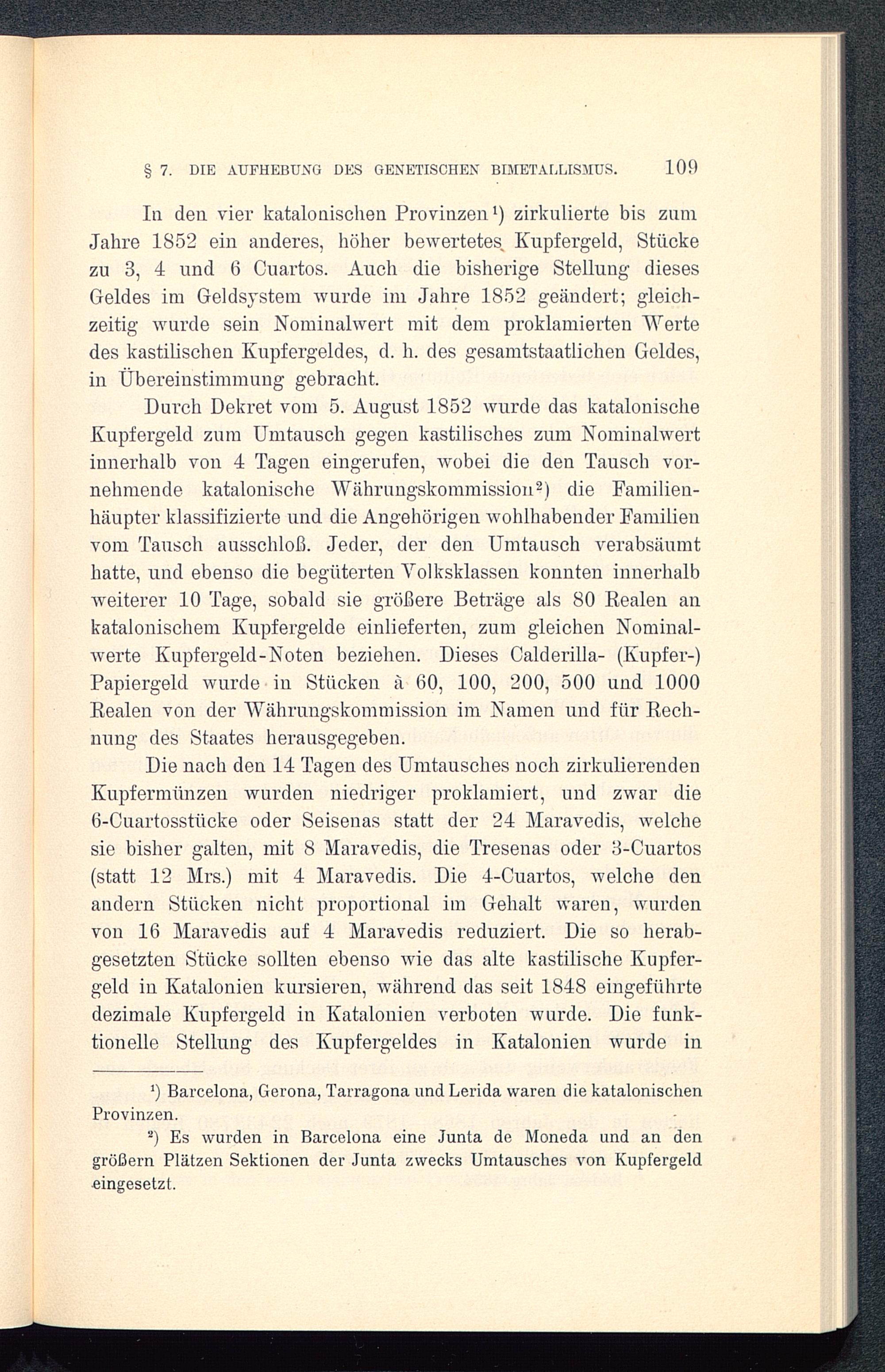 In den vier katalonischen Provinzen ¹) zirkulierte bis zumJahre 1852 ein anderes, höher bewertetes Kupfergeld, Stückezu 3, 4 und 6 Cuartos. Auch die bisherige Stellung diesesGeldes im Geldsystem wurde im Jahre 1852 geändert; gleich-zeitig wurde sein Nominalwert mit dem proklamierten Wertedes kastilischen Kupfergeldes, d. h. des gesamtstaatlichen Geldes,in Übereinstimmung gebracht.