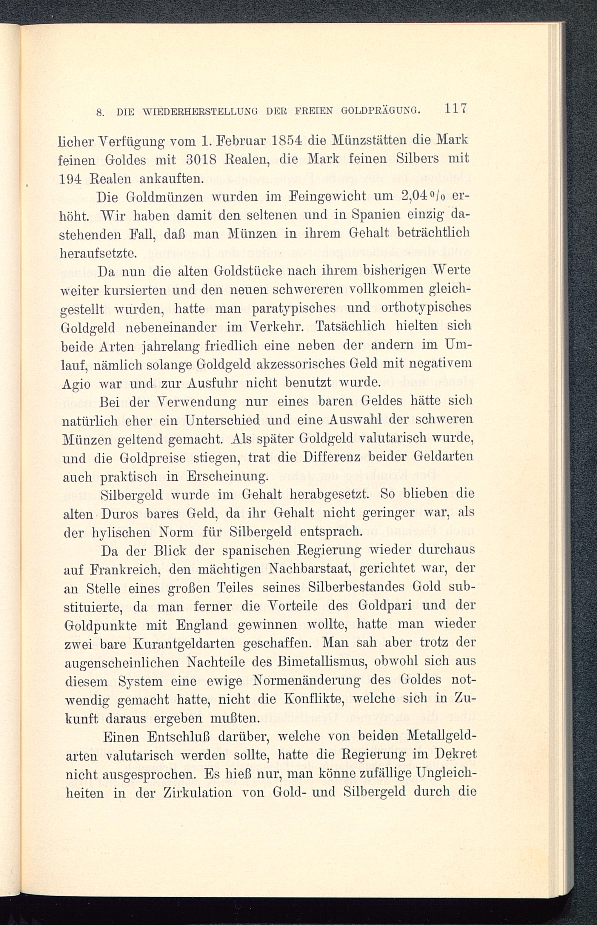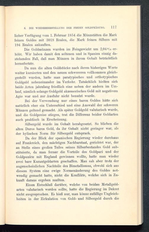 Da der Blick der spanischen Regierung wieder durchaus auf Frankreich, den mächtigen Nachbarstaat, gerichtet war, deran Stelle eines großen Teiles seines Silberbestandes Gold sub-stituierte, da man ferner die Vorteile des Goldpari und derGoldpunkte mit England gewinnen wollte, hatte man wiederzwei bare Kurantgeldarten geschaffen. Man sah aber trotz deraugenscheinlichen Nachteile des Bimetallismus, obwohl sich ausdiesem System eine ewige Normenänderung des Goldes not-wendig gemacht hatte, nicht die Konflikte, welche sich in Zu-kunft daraus ergeben mußten.