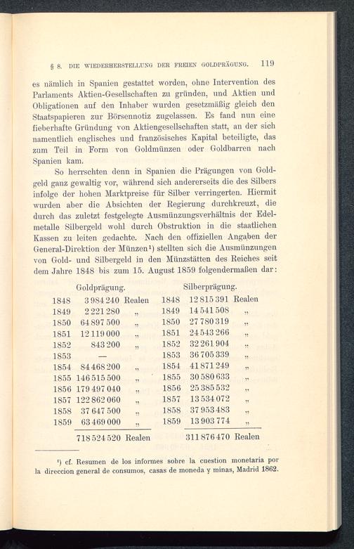es nämlich in Spanien gestattet worden, ohne Intervention desParlaments Aktien- Gesellschaften zu gründen, und Aktien undObligationen auf den Inhaber wurden gesetzmäßig gleich denStaatspapieren zur Börsennotiz zugelassen. Es fand nun einefieberhafte Gründung von Aktiengesellschaften statt, an der sichnamentlich englisches und französisches Kapital beteiligte, daszum Teil in Form von Goldmünzen oder Goldbarren nachSpanien kam.