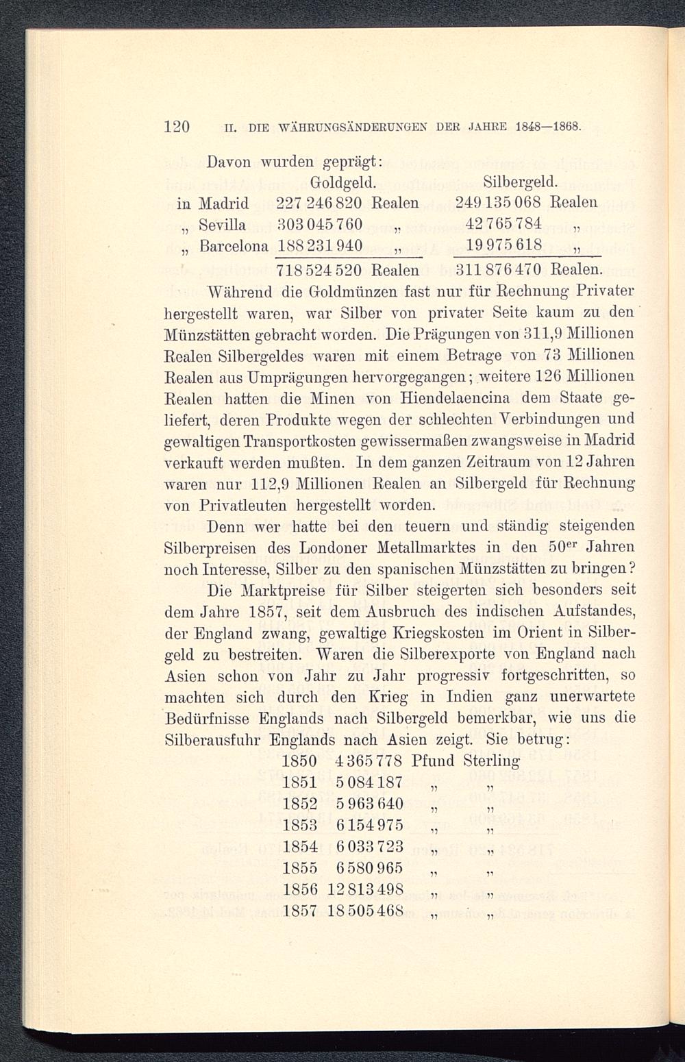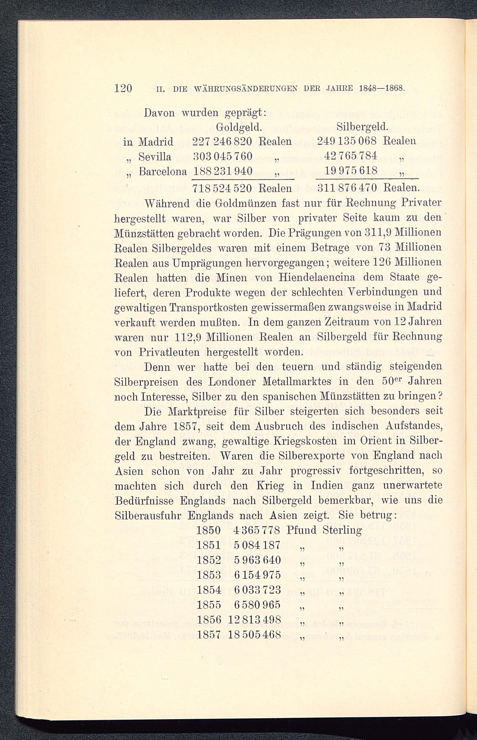 Denn wer hatte bei den teuern und ständig steigendenSilberpreisen des Londoner Metallmarktes in den 50er Jahrennoch Interesse, Silber zu den spanischen Münzstätten zu bringen?Die Marktpreise für Silber steigerten sich besonders seitdem Jahre 1857, seit dem Ausbruch des indischen Aufstandes,der England zwang, gewaltige Kriegskosten im Orient in Silber-geld zu bestreiten. Waren die Silberexporte von England nachAsien schon von Jahr zu Jahr progressiv fortgeschritten, somachten sich durch den Krieg in Indien ganz unerwarteteBedürfnisse Englands nach Silbergeld bemerkbar, wie uns dieSilberausfuhr Englands nach Asien zeigt. Sie betrug:1850 4365778 Pfund Sterling