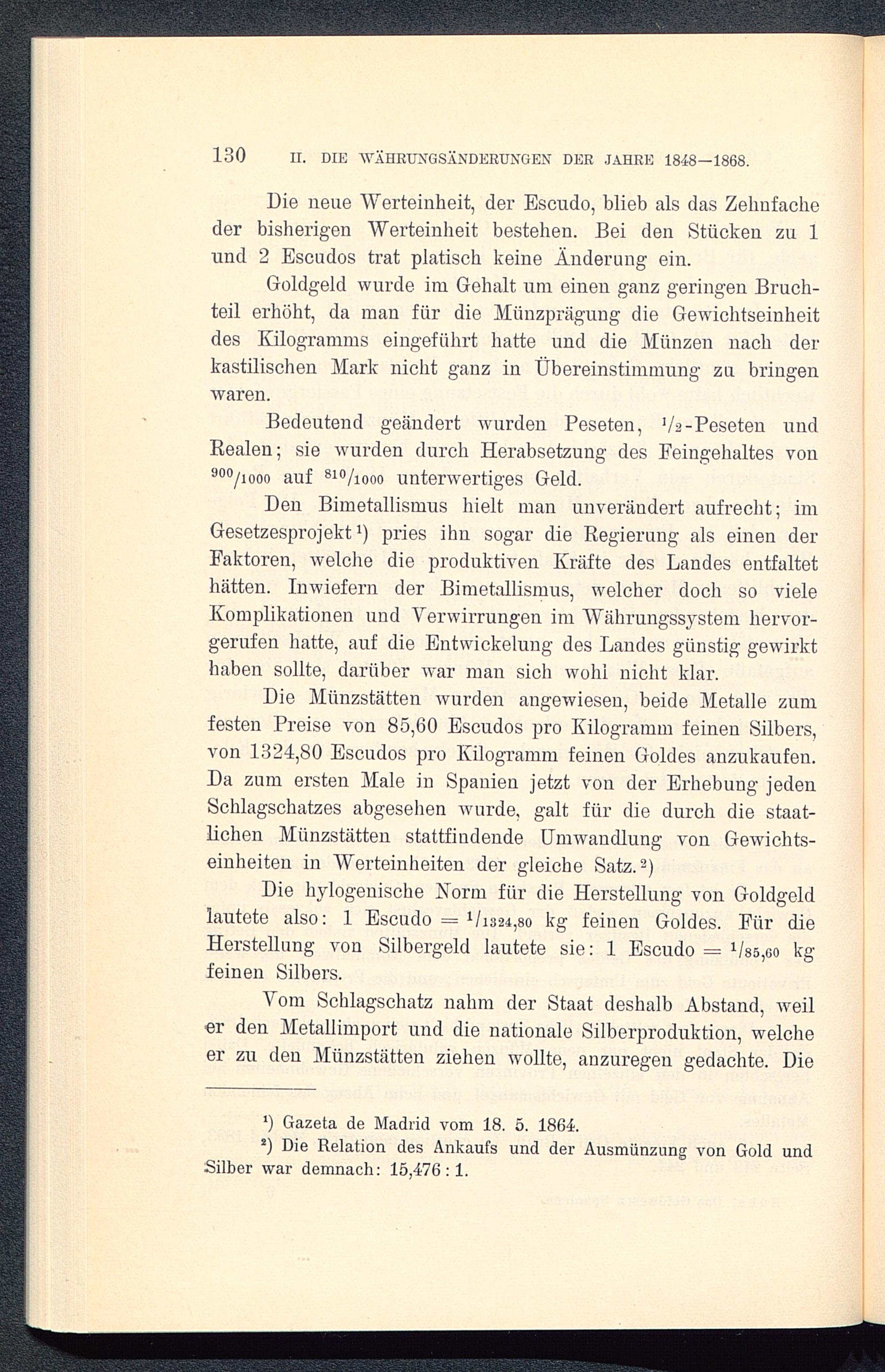 Goldgeld wurde im Gehalt um einen ganz geringen Bruch-teil erhöht, da man für die Münzprägung die Gewichtseinheitdes Kilogramms eingeführt hatte und die Münzen nach derkastilischen Mark nicht ganz in Übereinstimmung zu bringen.