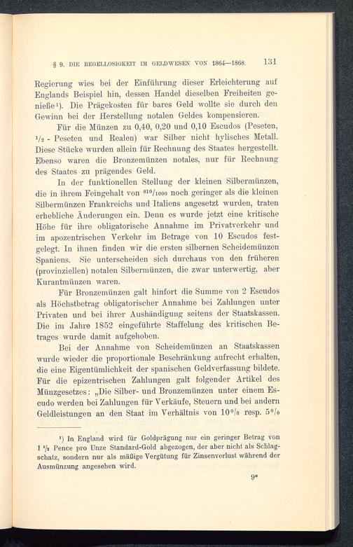 In der funktionellen Stellung der kleinen Silbermünzen,die in ihrem Feingehalt von 810/1000 noch geringer als die kleinen.Silbermünzen Frankreichs und Italiens angesetzt wurden, traten .erhebliche Änderungen ein. Denn es wurde jetzt eine kritischeHöhe für ihre obligatorische Annahme im Privatverkehr undim apozentrischen Verkehr im Betrage von 10 Escudos fest-gelegt. In ihnen finden wir die ersten silbernen ScheidemünzenSpaniens. Sie unterscheiden sich durchaus von den früheren( provinziellen) notalen Silbermünzen, die zwar unterwertig, aberKurantmünzen waren.