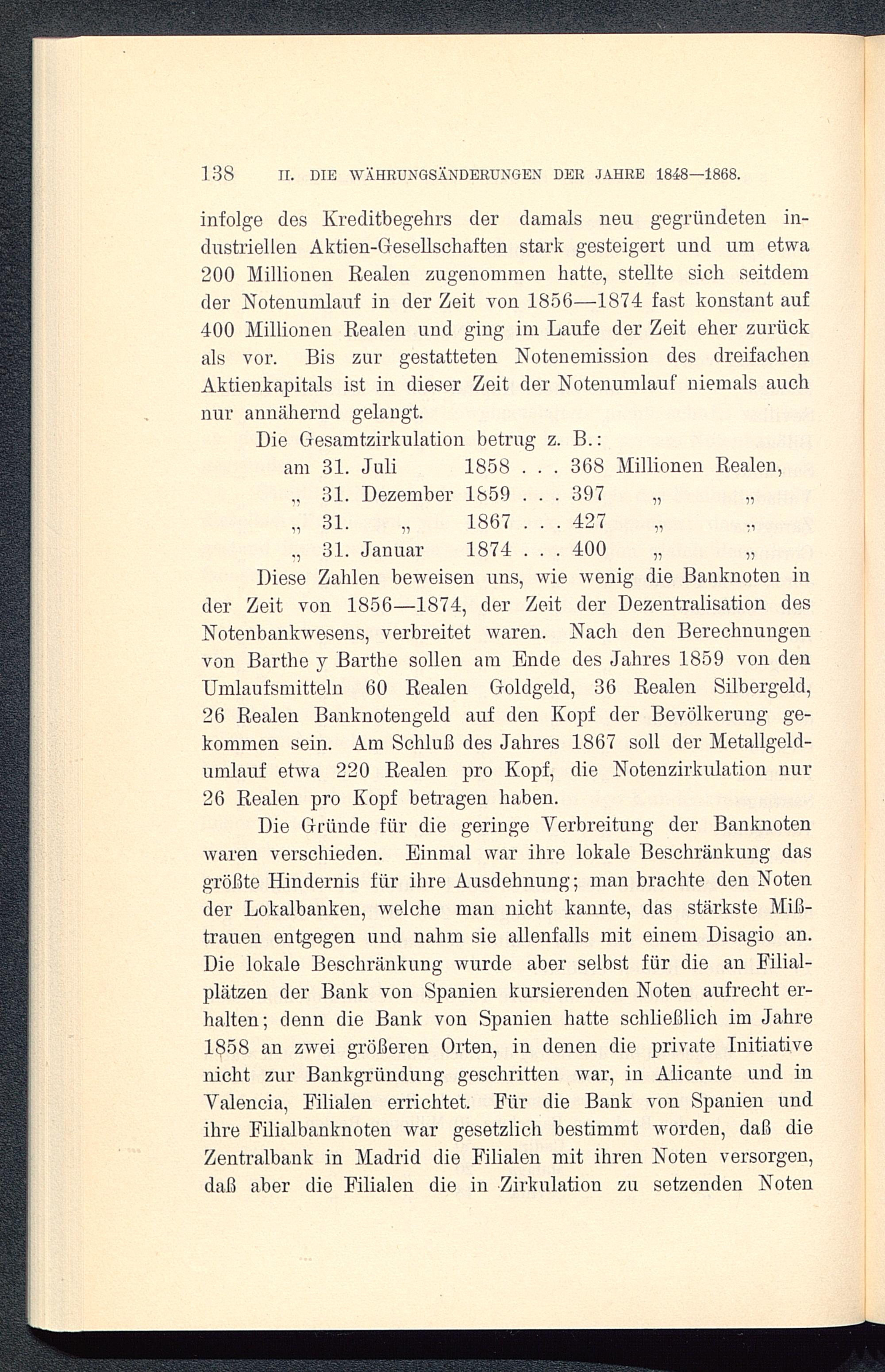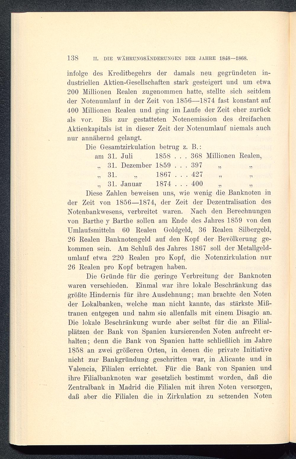 Diese Zahlen beweisen uns, wie wenig die Banknoten inder Zeit von 1856-1874, der Zeit der Dezentralisation desNotenbankwesens, verbreitet waren. Nach den Berechnungenvon Barthe y Barthe sollen am Ende des Jahres 1859 von denUmlaufsmitteln 60 Realen Goldgeld, 36 Realen Silbergeld,26 Realen Banknotengeld auf den Kopf der Bevölkerung ge-kommen sein. Am Schluß des Jahres 1867 soll der Metallgeld-umlauf etwa 220 Realen pro Kopf, die Notenzirkulation nur26 Realen pro Kopf betragen haben.