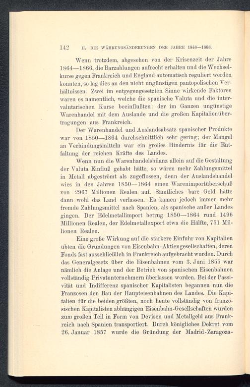 Wenn trotzdem, abgesehen von der Krisenzeit der Jahre1864-1866, die Barzahlungen aufrecht erhalten und die Wechsel-kurse gegen Frankreich und England automatisch reguliert werdenkonnten, so lag dies an den nicht ungünstigen pantopolischen Ver-hältnissen. Zwei im entgegengesetzten Sinne wirkende Faktorenwaren es namentlich, welche die spanische Valuta und die inter-valutarischen Kurse beeinflußten: der im Ganzen ungünstigeWarenhandel mit dem Auslande und die großen Kapitalienüber-tragungen aus Frankreich .