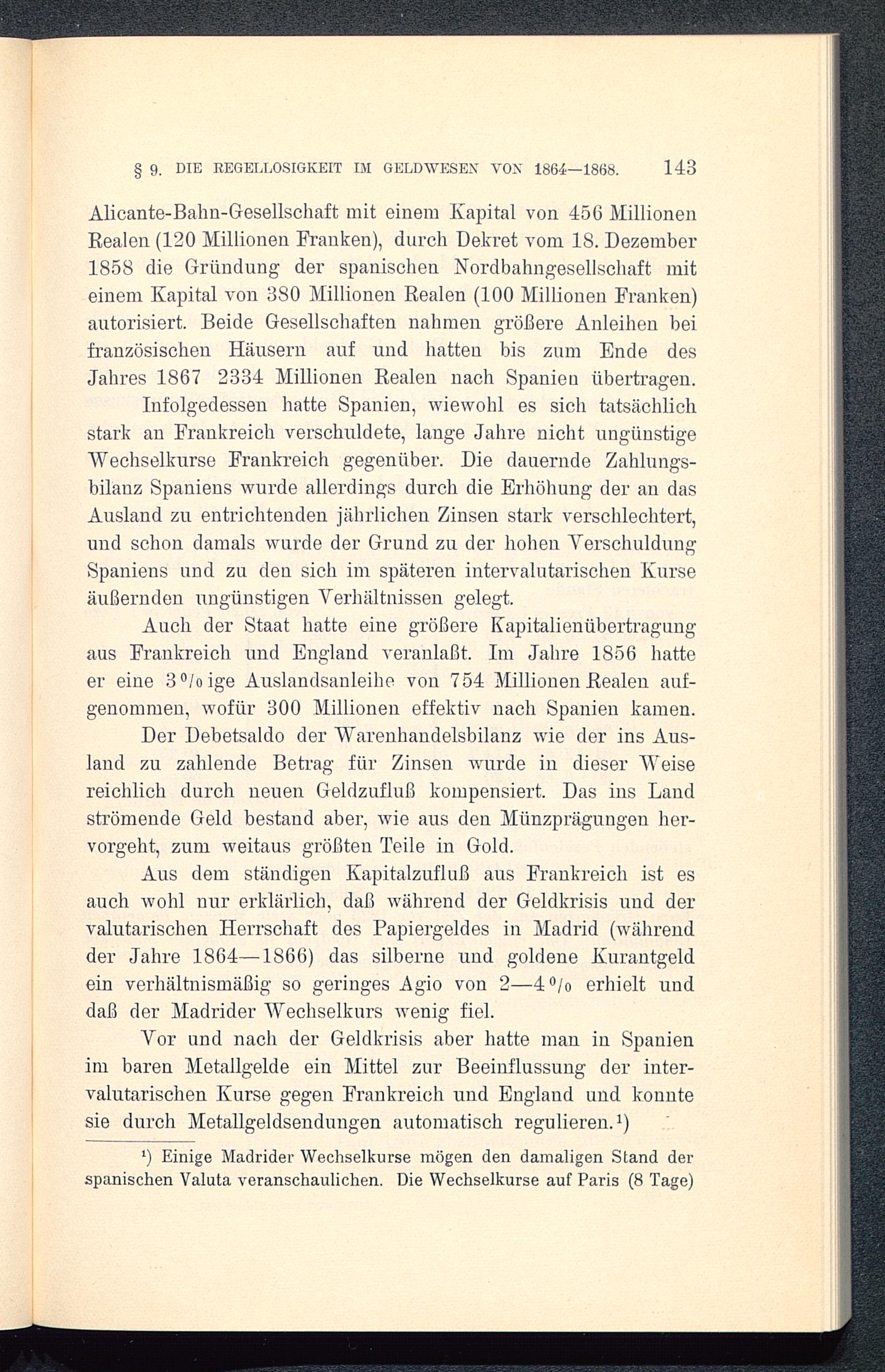 Aus dem ständigen Kapitalzufluß aus Frankreich ist esauch wohl nur erklärlich, daß während der Geldkrisis und dervalutarischen Herrschaft des Papiergeldes in Madrid ( währendder Jahre 1864-1866) das silberne und goldene Kurantgeldein verhältnismäßig so geringes Agio von 2-4% erhielt unddaß der Madrider Wechselkurs wenig fiel.