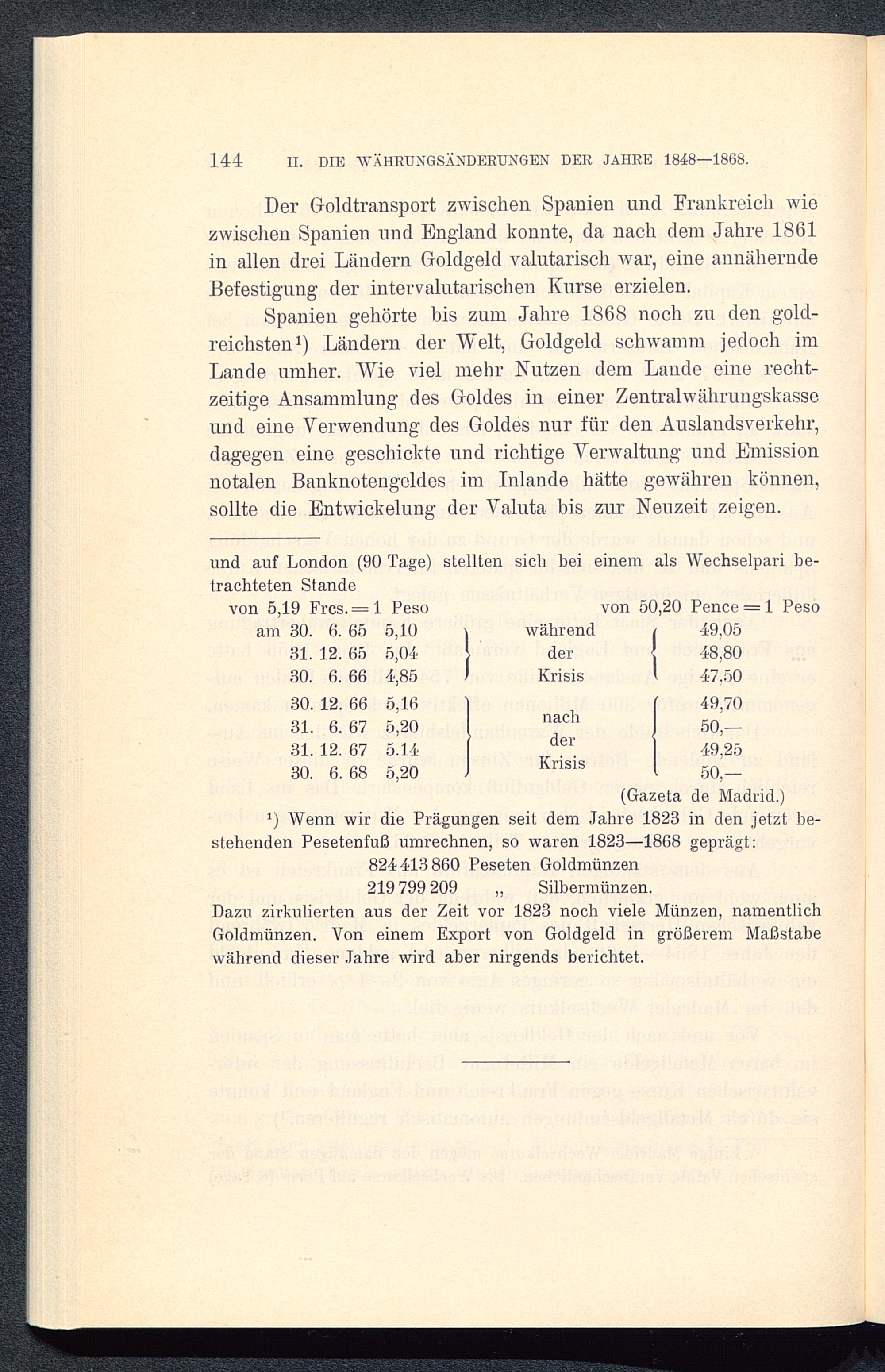 Der Goldtransport zwischen Spanien und Frankreich wiezwischen Spanien und England konnte, da nach dem Jahre 1861in allen drei Ländern Goldgeld valutarisch war, eine annäherndeBefestigung der intervalutarischen Kurse erzielen.