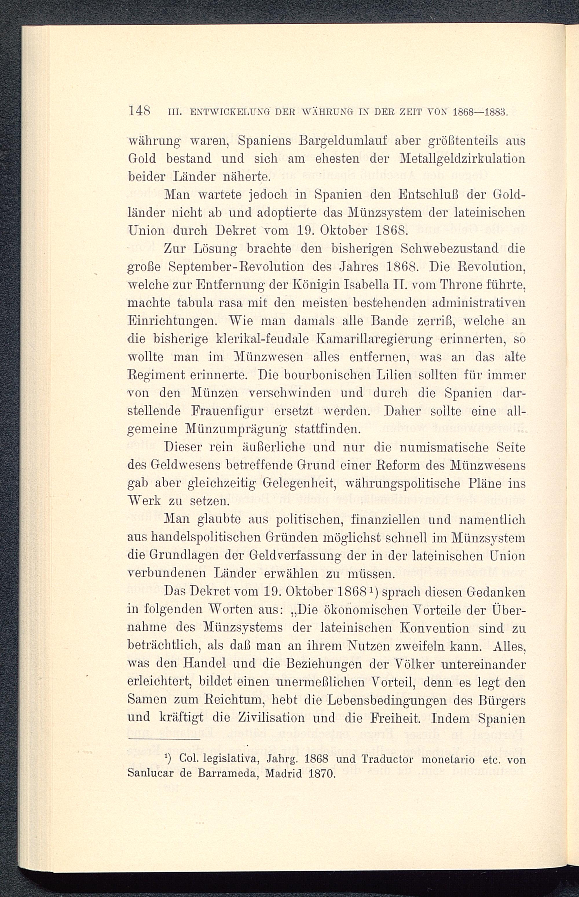 Das Dekret vom 19. Oktober 18681) sprach diesen Gedankenin folgenden Worten aus: ,, Die ökonomischen Vorteile der Über-nahme des Münzsystems der lateinischen Konvention sind zubeträchtlich, als daß man an ihrem Nutzen zweifeln kann. Alles,was den Handel und die Beziehungen der Völker untereinandererleichtert, bildet einen unermeßlichen Vorteil, denn es legt denSamen zum Reichtum, hebt die Lebensbedingungen des Bürgersund kräftigt die Zivilisation und die Freiheit. Indem Spanien