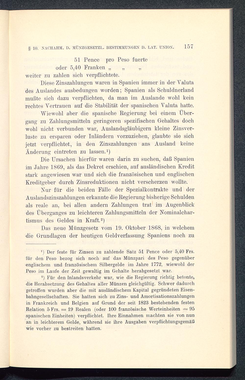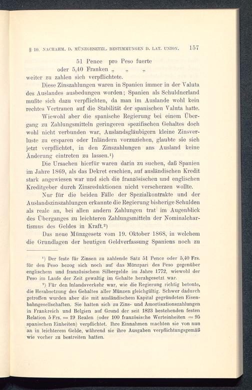 Wiewohl aber die spanische Regierung bei einem Über-gang zu Zahlungsmitteln geringeren spezifischen Gehaltes dochwohl nicht verbunden war, Auslandsgläubigern kleine Zinsver-luste zu ersparen oder Inländern vorzuziehen, glaubte sie sichjetzt verpflichtet, in den Zinszahlungen ans Ausland keineÄnderung eintreten zu lassen.1)