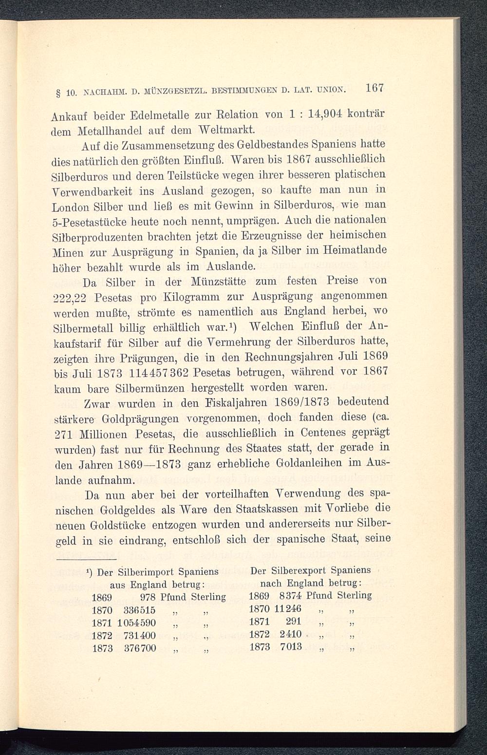 § 10. NACHAHM. D. MÜNZGESETZL. BESTIMMUNGEN D. LAT. UNION.Ankauf beider Edelmetalle zur Relation von 1: 14,904 konträrdem Metallhandel auf dem Weltmarkt.