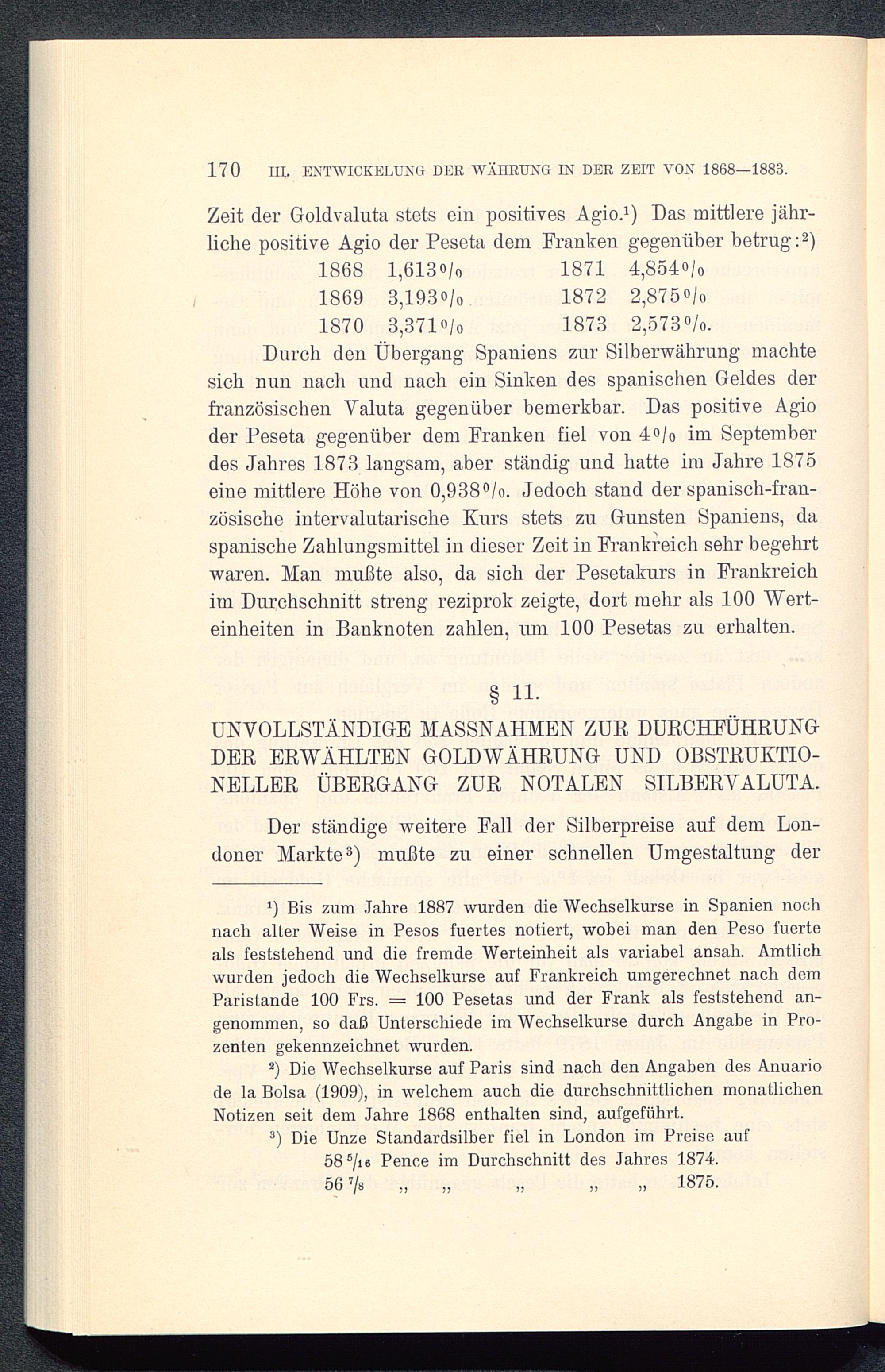 2) Die Wechselkurse auf Paris sind nach den Angaben des Anuariode la Bolsa( 1909), in welchem auch die durchschnittlichen monatlichenNotizen seit dem Jahre 1868 enthalten sind, aufgeführt.