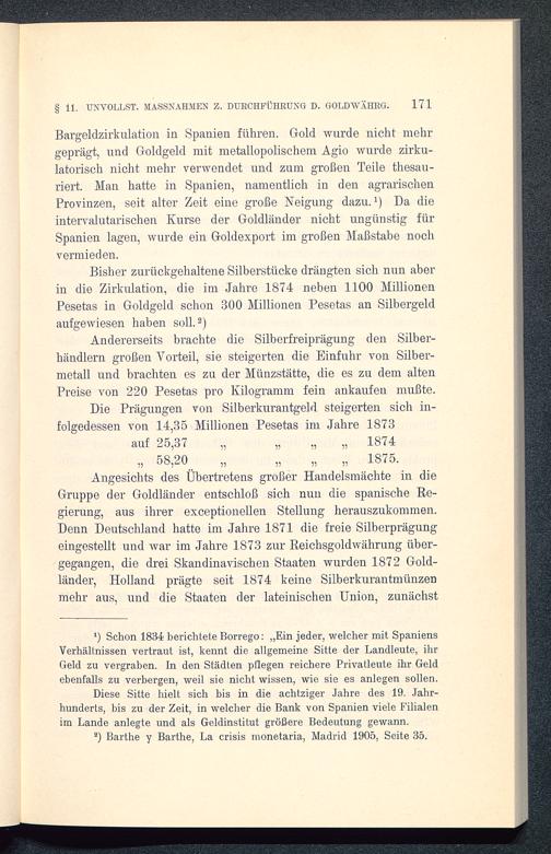Bisher zurückgehaltene Silberstücke drängten sich nun aberin die Zirkulation, die im Jahre 1874 neben 1100 MillionenPesetas in Goldgeld schon 300 Millionen Pesetas an Silbergeldaufgewiesen haben soll. 2)