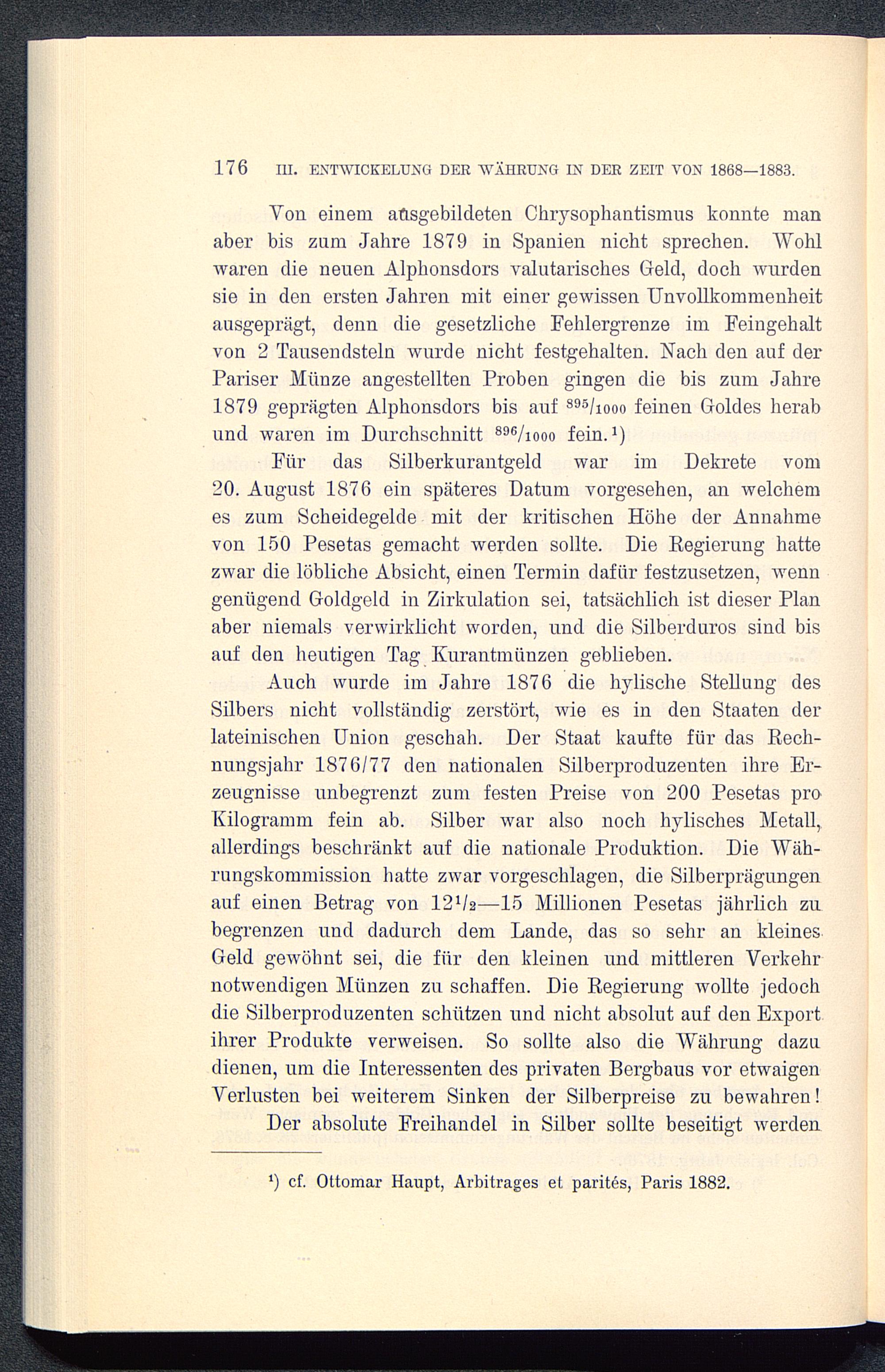 Von einem ausgebildeten Chrysophantismus konnte manaber bis zum Jahre 1879 in Spanien nicht sprechen. Wohlwaren die neuen Alphonsdors valutarisches Geld, doch wurdensie in den ersten Jahren mit einer gewissen Unvollkommenheitausgeprägt, denn die gesetzliche Fehlergrenze im Feingehaltvon 2 Tausendsteln wurde nicht festgehalten. Nach den auf derPariser Münze angestellten Proben gingen die bis zum Jahre1879 geprägten Alphonsdors bis auf 895/1000 feinen Goldes herabund waren im Durchschnitt 896/1000 fein. 1)