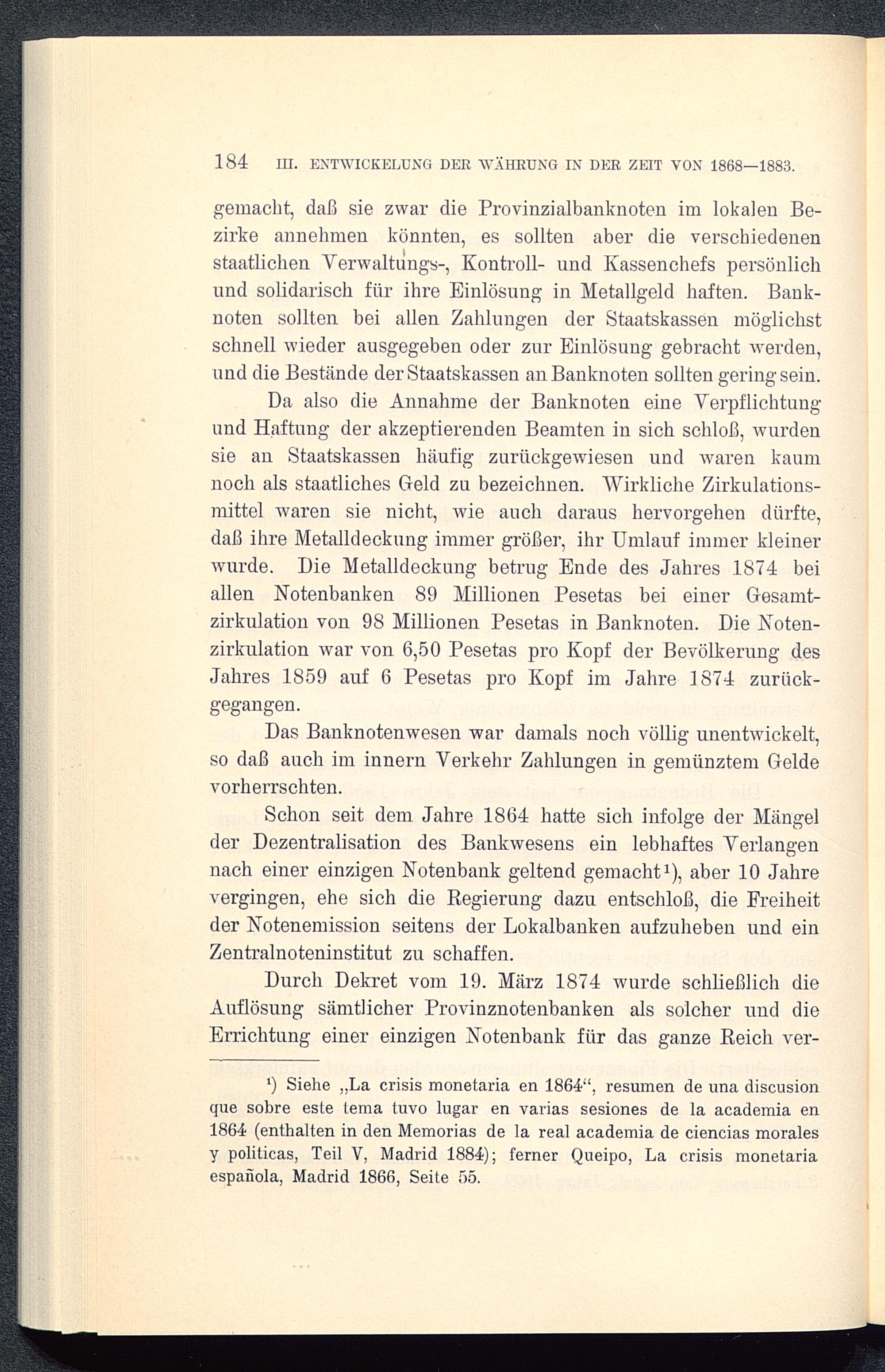 1) Siehe ,, La crisis monetaria en 1864", resumen de una discusionque sobre este tema tuvo lugar en varias sesiones de la academia en1864( enthalten in den Memorias de la real academia de ciencias moralesy politicas, Teil V, Madrid 1884); ferner Queipo, La crisis monetariaespañola, Madrid 1866, Seite 55.