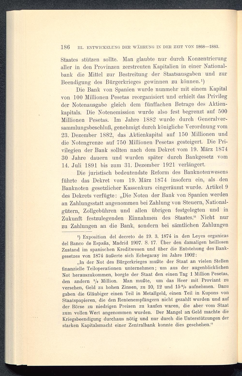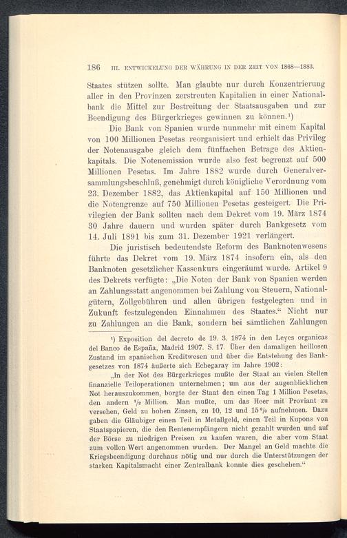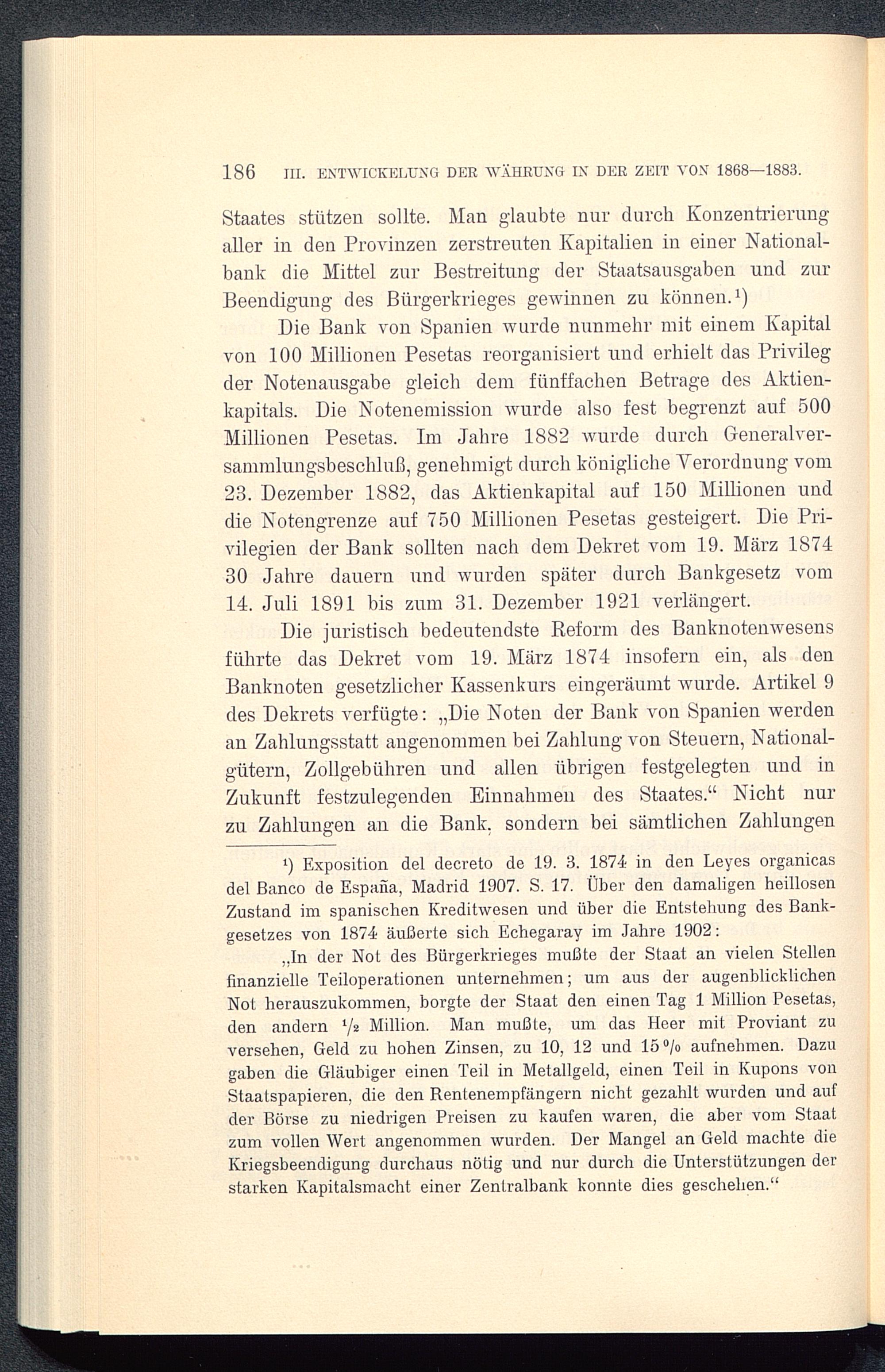 1) Exposition del decreto de 19. 3. 1874 in den Leyes organicasdel Banco de España, Madrid 1907. S. 17. Über den damaligen heillosenZustand im spanischen Kreditwesen und über die Entstehung des Bank-gesetzes von 1874 äußerte sich Echegaray im Jahre 1902: