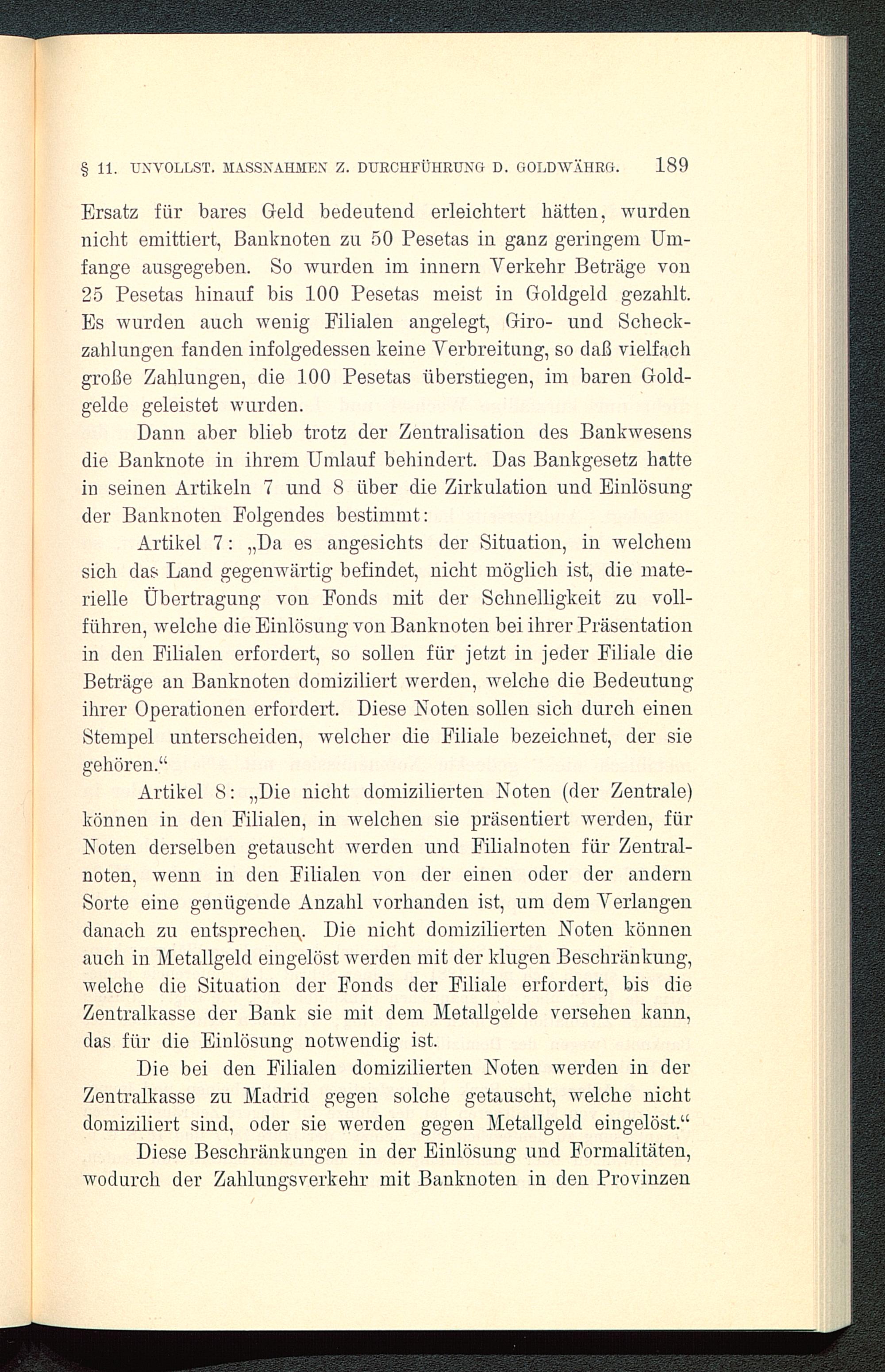 Artikel 8:„ Die nicht domizilierten Noten( der Zentrale)können in den Filialen, in welchen sie präsentiert werden, fürNoten derselben getauscht werden und Filialnoten für Zentral-noten, wenn in den Filialen von der einen oder der andernSorte eine genügende Anzahl vorhanden ist, um dem Verlangendanach zu entsprechen. Die nicht domizilierten Noten könnenauch in Metallgeld eingelöst werden mit der klugen Beschränkung,welche die Situation der Fonds der Filiale erfordert, bis dieZentralkasse der Bank sie mit dem Metallgelde versehen kann,das für die Einlösung notwendig ist.