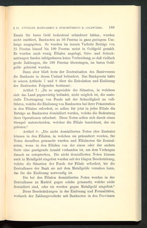 Ersatz für bares Geld bedeutend erleichtert hätten, wurden.nicht emittiert, Banknoten zu 50 Pesetas in ganz geringem Um-fange ausgegeben. So wurden im innern Verkehr Beträge von25 Pesetas hinauf bis 100 Pesetas meist in Goldgeld gezahlt.Es wurden auch wenig Filialen angelegt, Giro- und Scheck-zahlungen fanden infolgedessen keine Verbreitung, so daß vielfachgroße Zahlungen, die 100 Pesetas überstiegen, im baren Gold-gelde geleistet wurden.