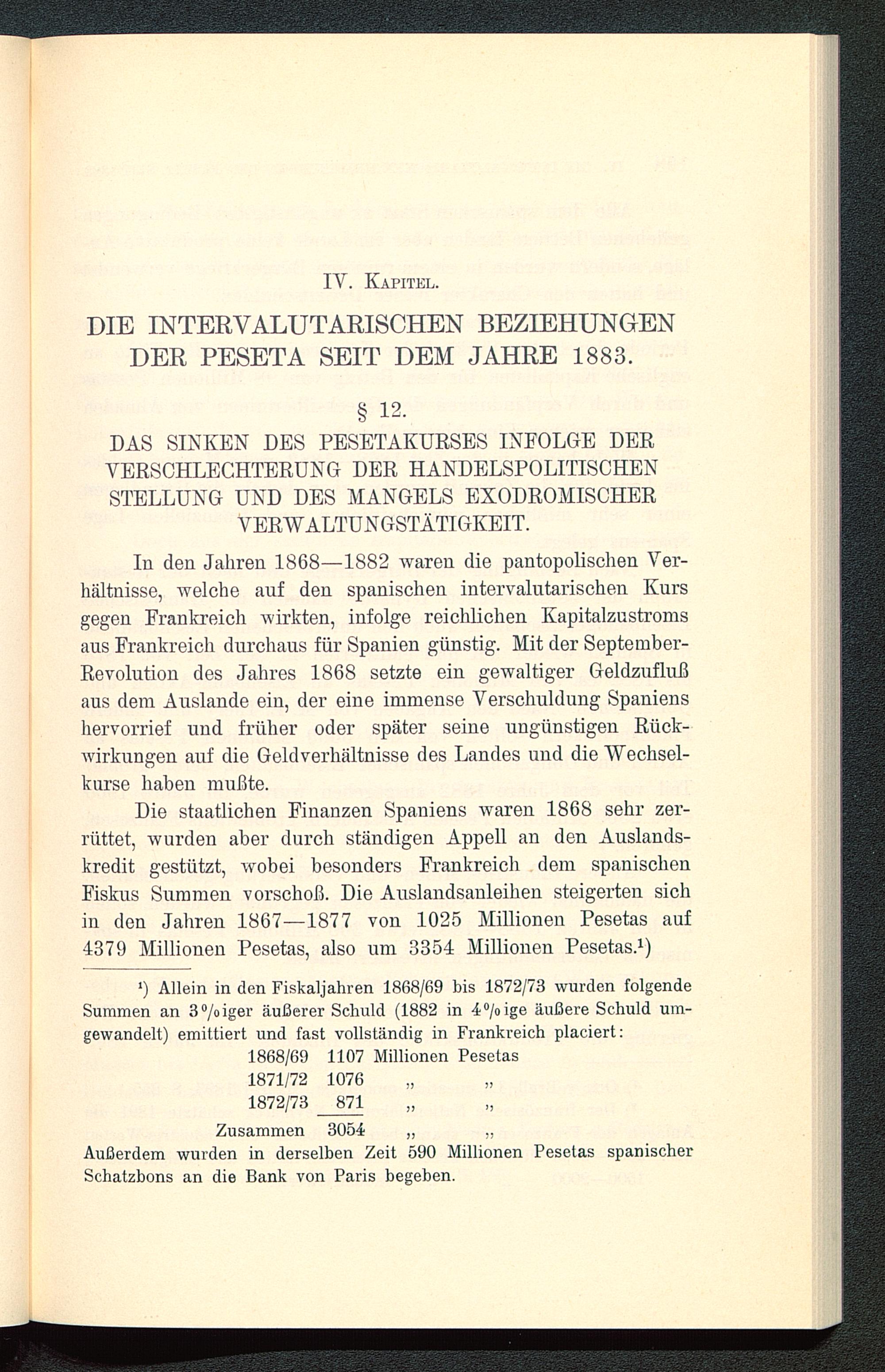 1) Allein in den Fiskaljahren 1868/69 bis 1872/73 wurden folgendeSummen an 3% iger äußerer Schuld( 1882 in 4% ige äußere Schuld um-gewandelt) emittiert und fast vollständig in Frankreich placiert:1868/69 1107 Millionen Pesetas