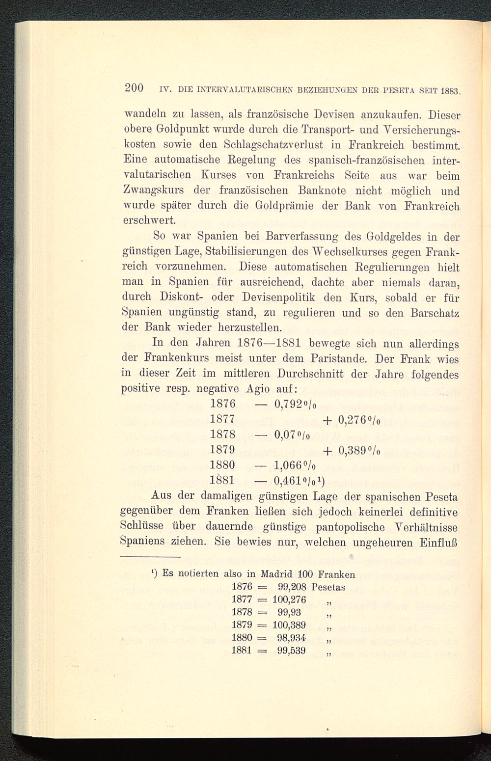 So war Spanien bei Barverfassung des Goldgeldes in dergünstigen Lage, Stabilisierungen des Wechselkurses gegen Frank- reich vorzunehmen. Diese automatischen Regulierungen hieltman in Spanien für ausreichend, dachte aber niemals daran,durch Diskont- oder Devisenpolitik den Kurs, sobald er für Spanien ungünstig stand, zu regulieren und so den Barschatzder Bank wieder herzustellen.