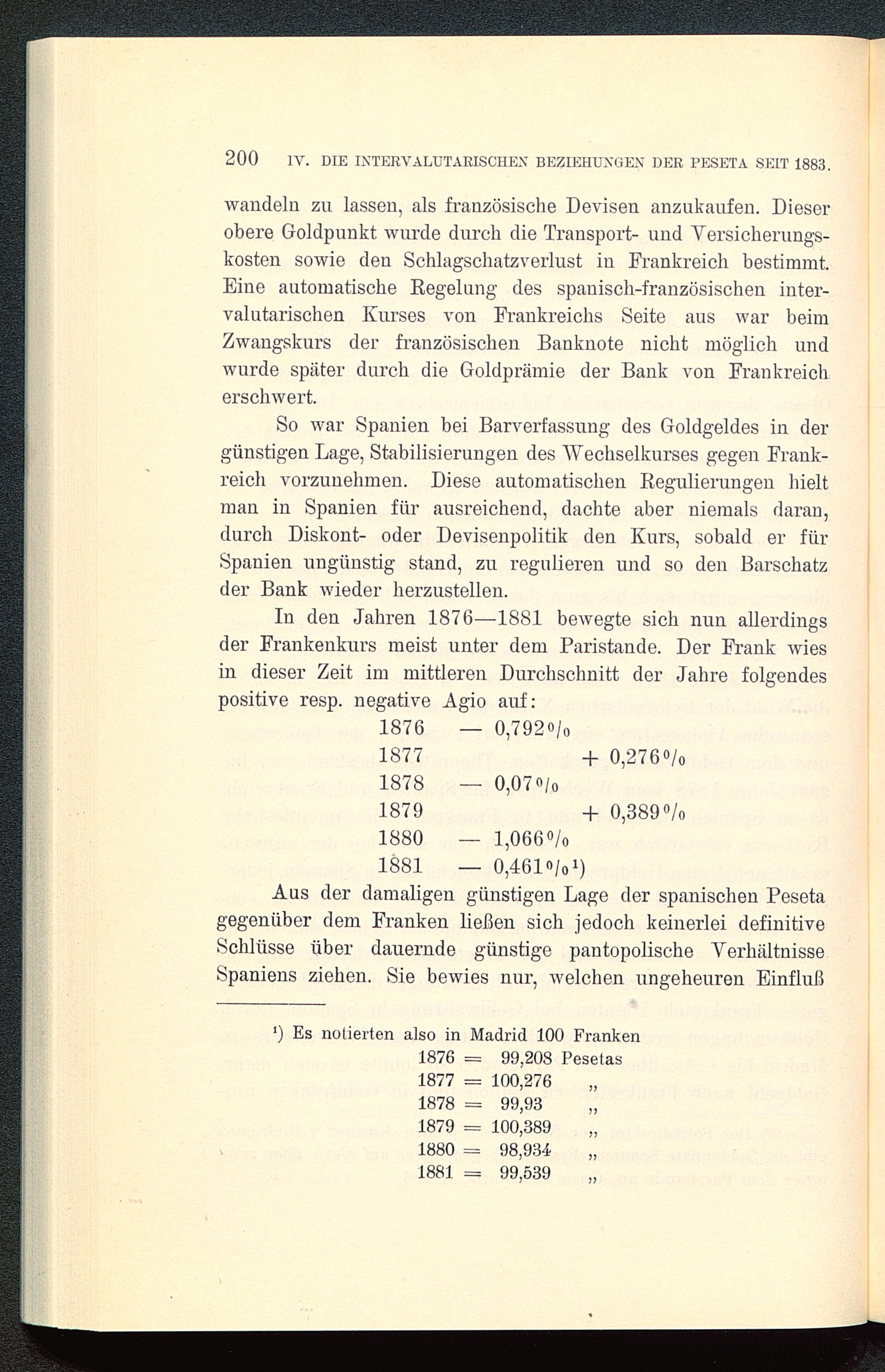 In den Jahren 1876-1881 bewegte sich nun allerdingsder Frankenkurs meist unter dem Paristande. Der Frank wiesin dieser Zeit im mittleren Durchschnitt der Jahre folgendespositive resp. negative Agio auf: