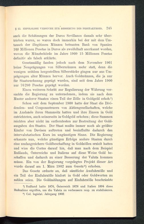 Einen weiteren Schritt zur Regulierung der Währung ver-suchte die Regierung zu unternehmen, indem sie nach demMuster anderer Staaten einen Teil der Zölle in Goldgeld erhob.1)Schon seit dem September 1900 hatte der Staat die Divi-denden- und Couponssteuern von Aktiengesellschaften, welcheim Auslande ihren Stammsitz hatten und ihre Zinsen in Goldentrichteten, auch seinerseits in Goldgeld erhoben; diese Summenreichten aber nicht im entferntesten zur Bestreitung der Gold-ausgaben des Staates. Der Staat mußte immer noch als größterKäufer von Devisen auftreten und beeinflußte dadurch denintervalutarischen Kurs im ungünstigen Sinne. Die Regierungerkannte nun, welche günstigen Erfolge andere Staaten durcheine umfangreichere Goldbeschaffung in Goldzöllen erzielt hatten.und wies die Cortes darauf hin, daß man nach dem BeispielRußlands, Österreichs und Italiens auf diese Weise Gold be-schaffen und dadurch zu einer Besserung der Valuta kommenmüsse. Ein von der Regierung vorgelegtes Projekt dieser Artwurde darauf am 1. März 1902 zum Gesetz 2) erhoben.