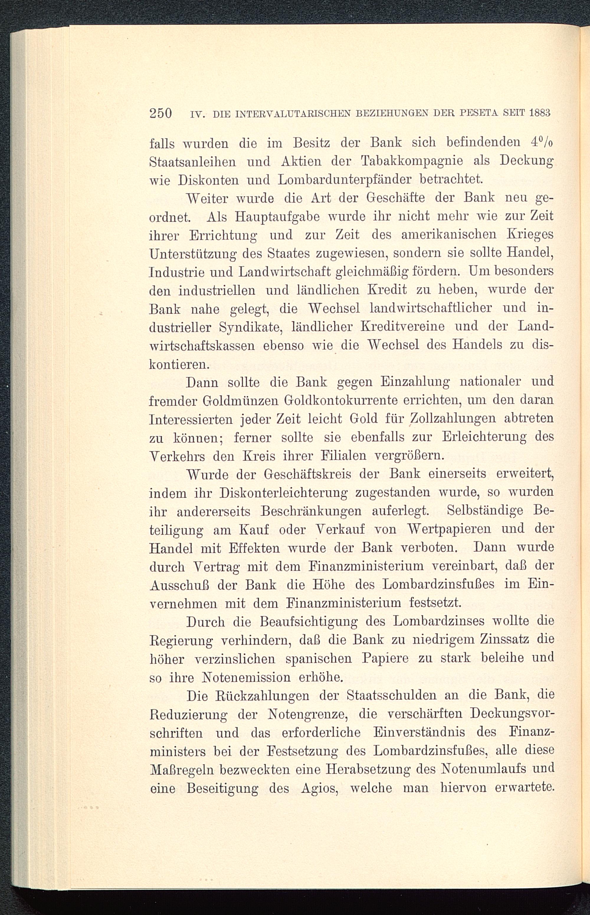 Durch die Beaufsichtigung des Lombardzinses wollte dieRegierung verhindern, daß die Bank zu niedrigem Zinssatz diehöher verzinslichen spanischen Papiere zu stark beleihe undso ihre Notenemission erhöhe.