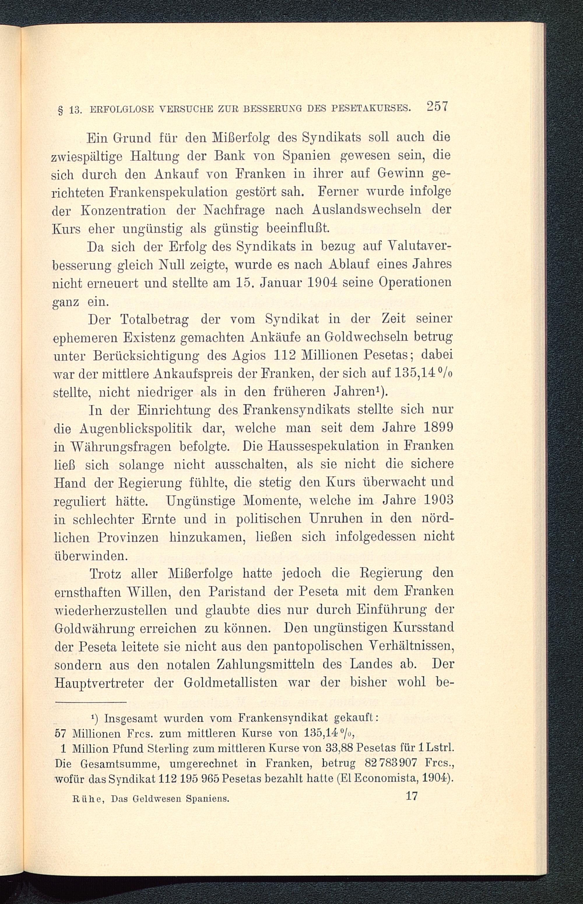 Der Totalbetrag der vom Syndikat in der Zeit seinerephemeren Existenz gemachten Ankäufe an Goldwechseln betrugunter Berücksichtigung des Agios 112 Millionen Pesetas; dabeiwar der mittlere Ankaufspreis der Franken, der sich auf 135,14%stellte, nicht niedriger als in den früheren Jahren¹).