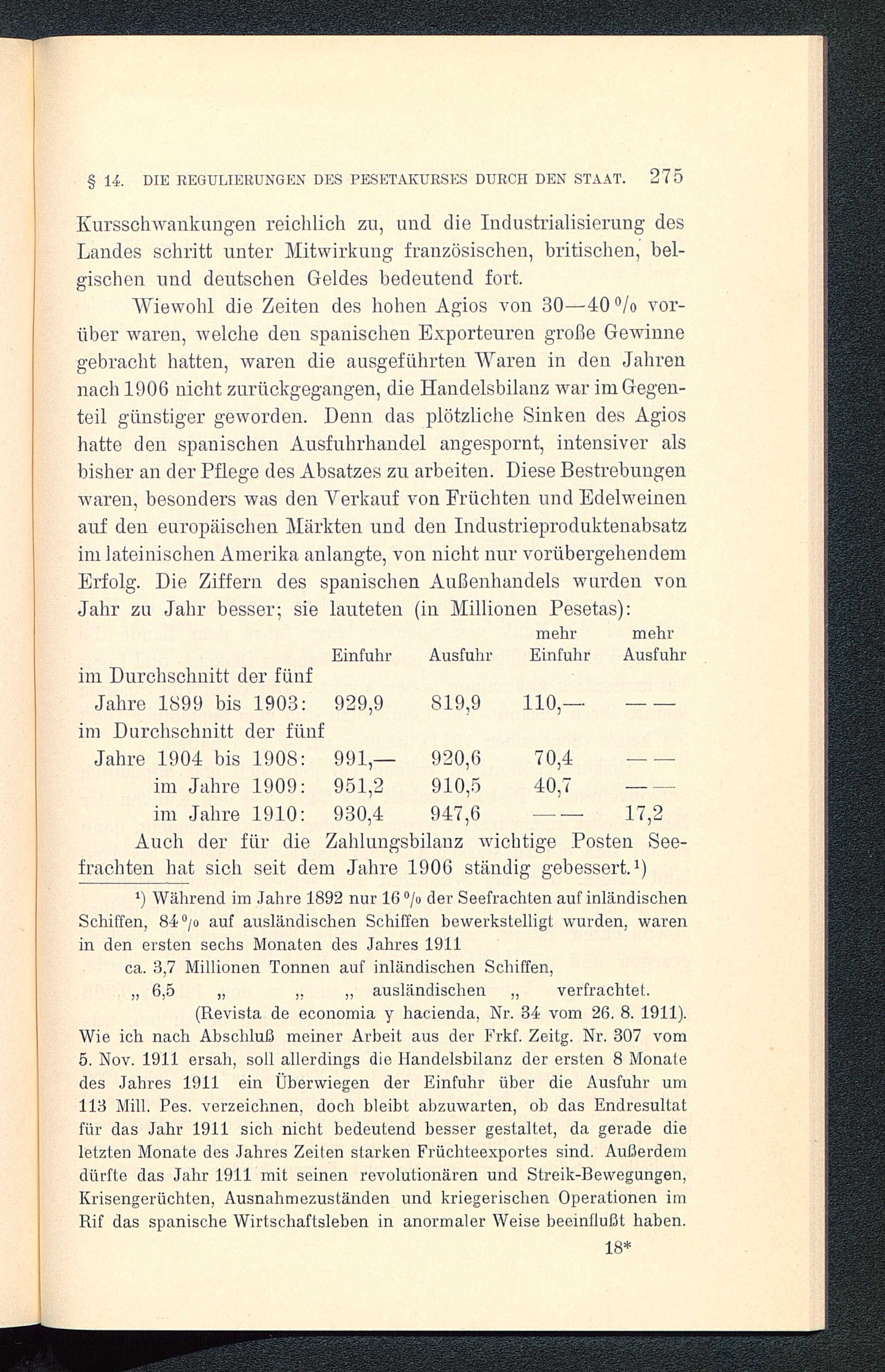 Wiewohl die Zeiten des hohen Agios von 30-40% vor-über waren, welche den spanischen Exporteuren große Gewinnegebracht hatten, waren die ausgeführten Waren in den Jahren.nach 1906 nicht zurückgegangen, die Handelsbilanz war im Gegen-teil günstiger geworden. Denn das plötzliche Sinken des Agioshatte den spanischen Ausfuhrhandel angespornt, intensiver alsbisher an der Pflege des Absatzes zu arbeiten. Diese Bestrebungenwaren, besonders was den Verkauf von Früchten und Edelweinenauf den europäischen Märkten und den Industrieproduktenabsatzim lateinischen Amerika anlangte, von nicht nur vorübergehendemErfolg. Die Ziffern des spanischen Außenhandels wurden vonJahr zu Jahr besser; sie lauteten( in Millionen Pesetas):