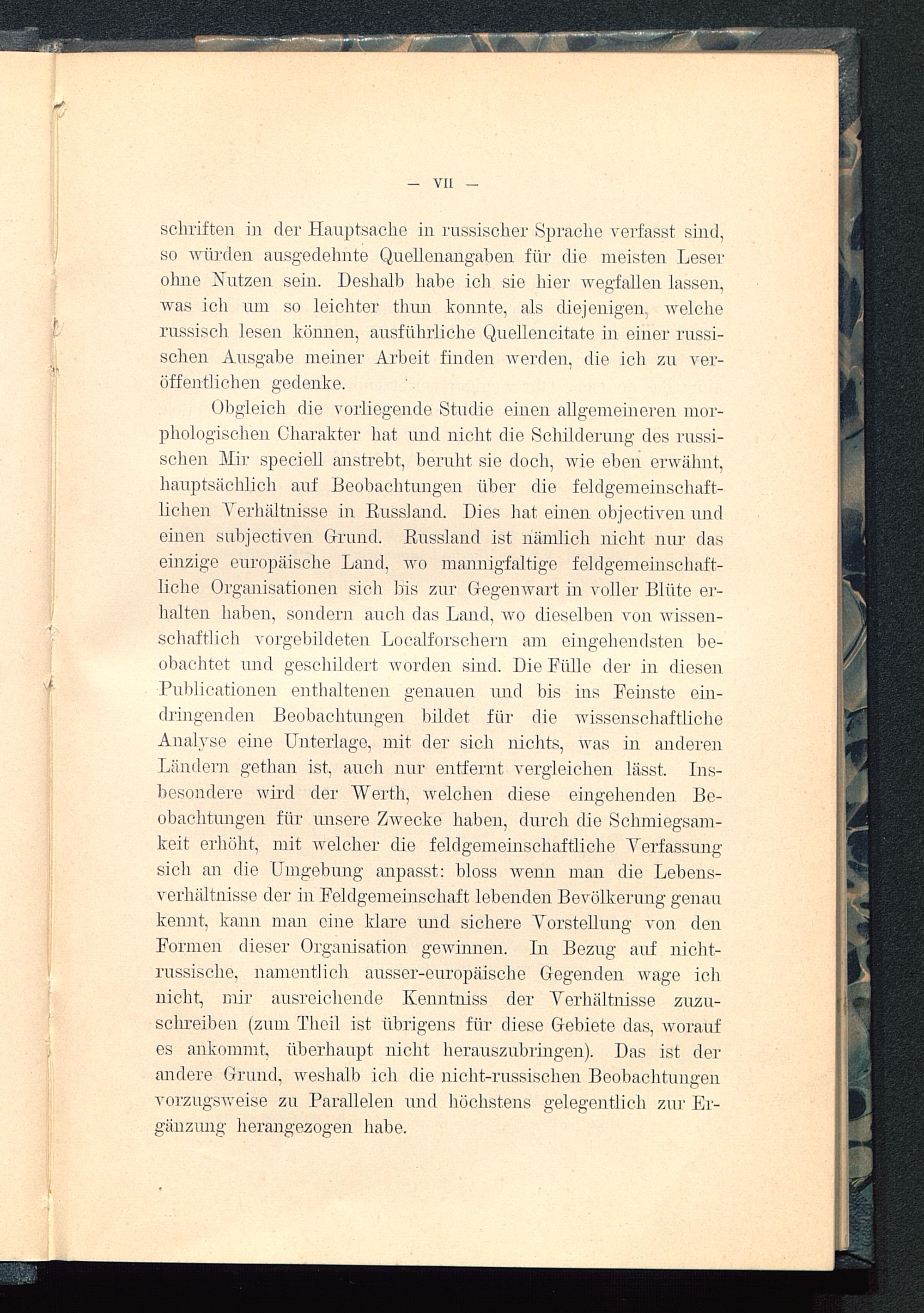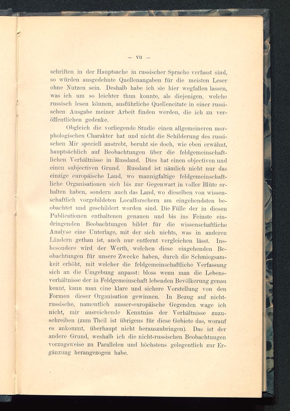 Obgleich die vorliegende Studie einen allgemeineren mor-phologischen Charakter hat und nicht die Schilderung des russi-schen Mir speciell anstrebt, beruht sie doch, wie eben erwähnt,hauptsächlich auf Beobachtungen über die feldgemeinschaft-lichen Verhältnisse in Russland . Dies hat einen objectiven undeinen subjectiven Grund. Russland ist nämlich nicht nur daseinzige europäische Land, wo mannigfaltige feldgemeinschaft-liche Organisationen sich bis zur Gegenwart in voller Blüte er-halten haben, sondern auch das Land, wo dieselben von wissen-schaftlich vorgebildeten Localforschern am eingehendsten be-obachtet und geschildert worden sind. Die Fülle der in diesenPublicationen enthaltenen genauen und bis ins Feinste ein-dringenden Beobachtungen bildet für die wissenschaftlicheAnalyse eine Unterlage, mit der sich nichts, was in anderenLändern gethan ist, auch nur entfernt vergleichen lässt. Ins-besondere wird der Werth, welchen diese eingehenden Be-obachtungen für unsere Zwecke haben, durch die Schmiegsam-keit erhöht, mit welcher die feldgemeinschaftliche Verfassungsich an die Umgebung anpasst: bloss wenn man die Lebens-verhältnisse der in Feldgemeinschaft lebenden Bevölkerung genaukennt, kann man eine klare und sichere Vorstellung von denFormen dieser Organisation gewinnen. In Bezug auf nicht-russische, namentlich ausser-europäische Gegenden wage ichnicht, mir ausreichende Kenntniss der Verhältnisse zuzu-schreiben (zum Tlieil ist übrigens für diese Gebiete das, woraufes ankommt, überhaupt nicht herauszubringen). Das ist derandere Grund, weshalb ich die nicht-russischen Beobachtungenvorzugsweise zu Parallelen und höchstens gelegentlich zur Er-gänzung herangezogen habe.