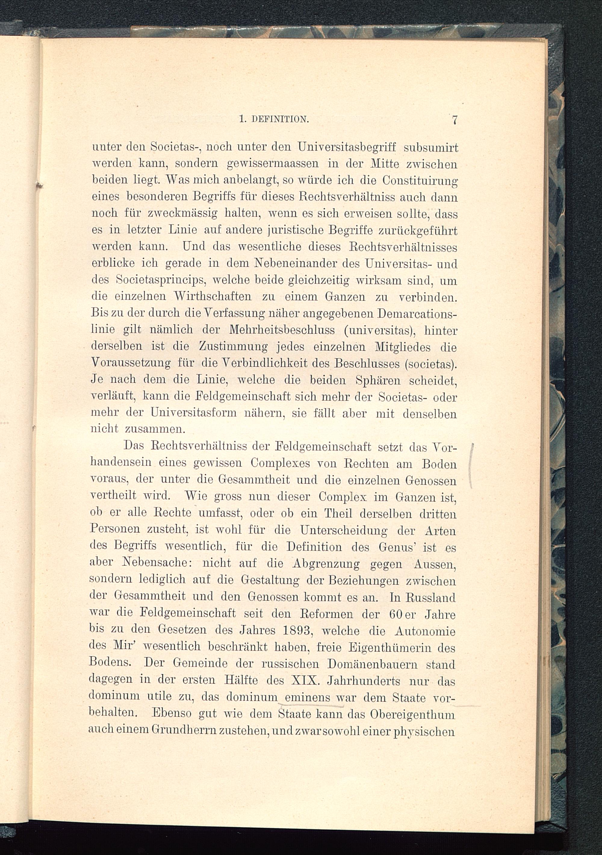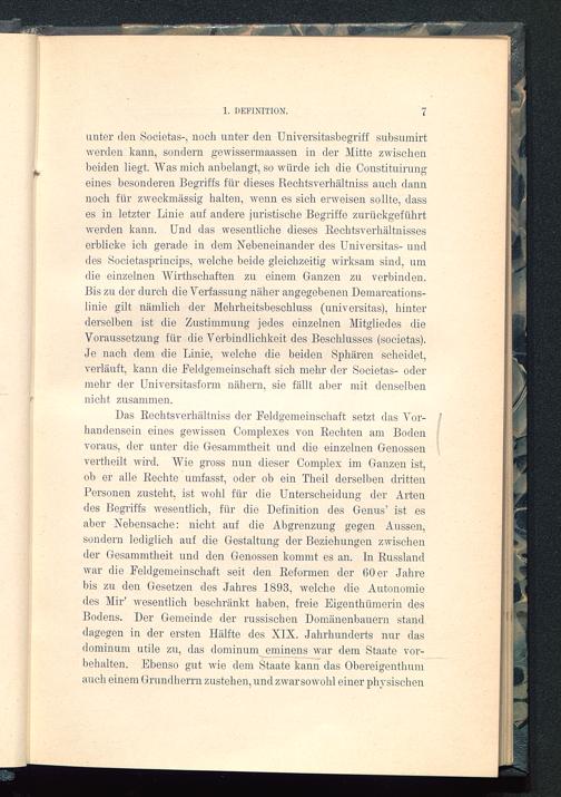 Das Rechtsverhältniss der Feldgemeinschaft setzt das Vor- 'handensein eines gewissen Complexes von Rechten am Bodenvoraus, der unter die Gesammtheit und die einzelnen Genossenvertheilt wird. Wie gross nun dieser Complex im Ganzen ist,ob er alle Rechte umfasst, oder ob ein Theil derselben drittenPersonen zusteht, ist wohl für die Unterscheidung der Artendes Begriffs wesentlich, für die Definition des Genus ’ ist esaber Nebensache: nicht auf die Abgrenzung gegen Aussen,sondern lediglich auf die Gestaltung der Beziehungen zwischender Gesammtheit und den Genossen kommt es an. In Russland war die Feldgemeinschaft seit den Reformen der 60 er Jahrebis zu den Gesetzen des Jahres 1893, welche die Autonomiedes Mir’ Avesentlich beschränkt haben, freie Eigenthümerin desBodens. Der Gemeinde der russischen Domänenbauern standdagegen in der ersten Hälfte des XIX. Jahrhunderts nur dasdominum utile zu, das dominum eminens war dem Staate Vor-behalten. Ebenso gut wie dem Staate kann das Obereigenthuniauch einem Grundherrn zustehen, und zwar sowohl einer physischen
