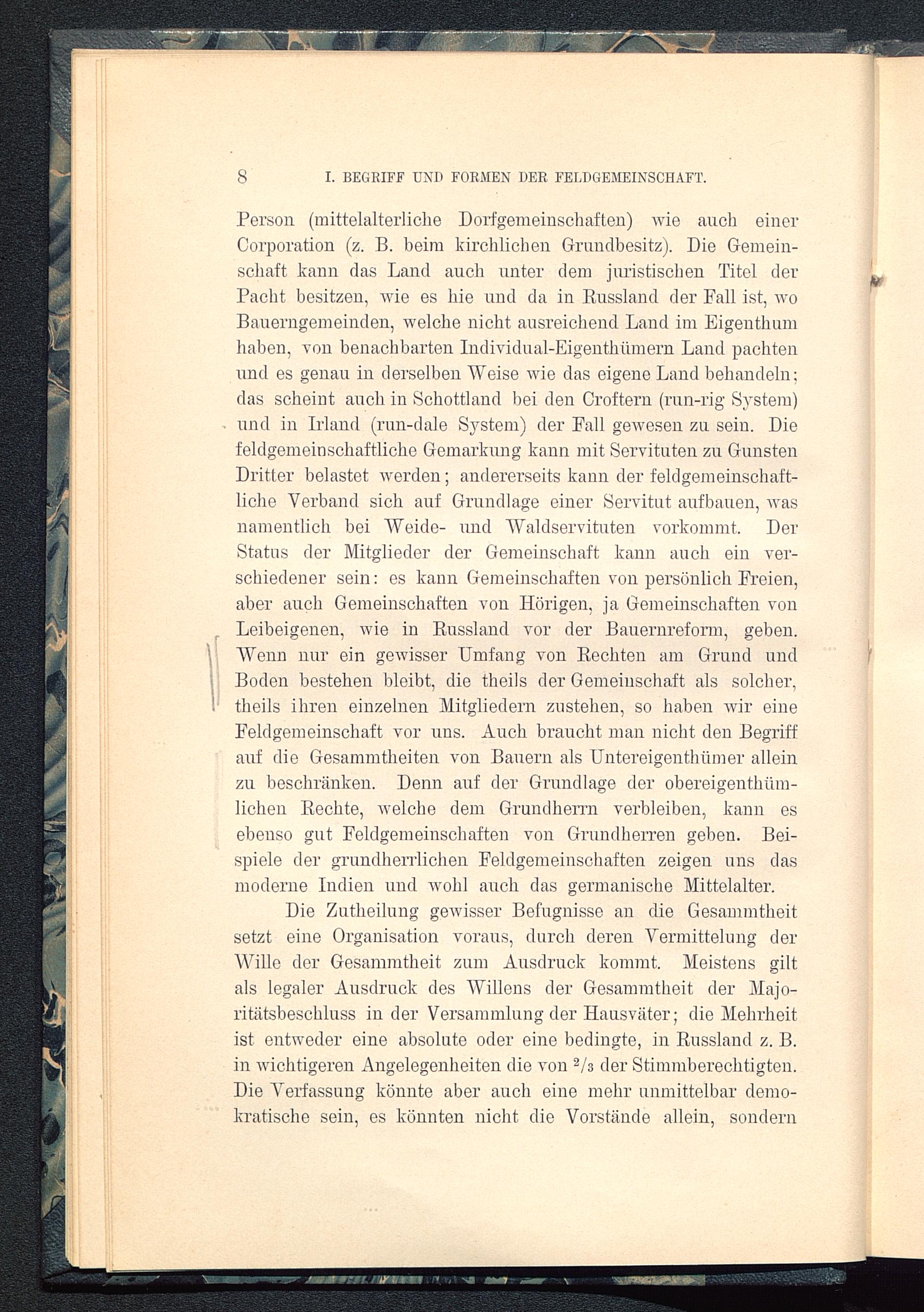 Person (mittelalterliche Dorfgemeinschaften) wie auch einerCorporation (z. B. beim kirchlichen Grundbesitz). Die Gemein-schaft kann das Land auch unter dem juristischen Titel derPacht besitzen, wie es hie und da in Russland der Fall ist, woBauerngemeinden, welche nicht ausreichend Land im Eigenthumhaben, von benachbarten Individual-EigenthÜrnern Land pachtenund es genau in derselben Weise wie das eigene Land behandeln;das scheint auch in Schottland bei den Croftern (run-rig System)und in Irland (run-dale System) der Fall gewesen zu sein. Diefeldgemeinschaftliche Gemarkung kann mit Servituten zu GunstenDritter belastet werden; andererseits kann der feldgemeinschaft-liche Verband sich auf Grundlage einer Servitut auf bauen, wasnamentlich bei Weide- und Waldservituten vorkommt. DerStatus der Mitglieder der Gemeinschaft kann auch ein ver-schiedener sein: es kann Gemeinschaften von persönlich Freien,aber auch Gemeinschaften von Hörigen, ja Gemeinschaften vonLeibeigenen, wie in Russland vor der Bauernreform, geben.Wenn nur ein gewisser Umfang von Rechten am Grund undBoden bestehen bleibt, die theils der Gemeinschaft als solcher,theils ihren einzelnen Mitgliedern zustehen, so haben wir eineFeldgemeinschaft vor uns. Auch braucht man nicht den Begriffauf die Gesammtheiten von Bauern als Untereigenthümer alleinzu beschränken. Denn auf der Grundlage der obereigentliüm-lichen Rechte, welche dem Grundherrn verbleiben, kann esebenso gut Feldgemeinschaften von Grundherren geben. Bei-spiele der grundherrlichen Feldgemeinschaften zeigen uns dasmoderne Indien und wohl auch das germanische Mittelalter.