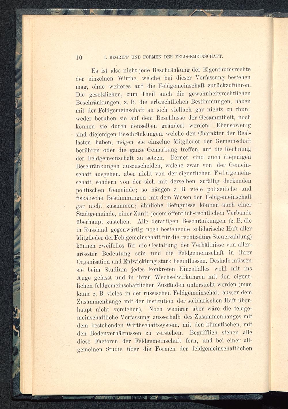 Es ist also nicht jede Beschränkung der Eigenthumsrechteder einzelnen Wirthe, welche bei dieser Verfassung bestehenmag, ohne weiteres auf die Feldgemeinschaft zurückzuführen.Die gesetzlichen, zum Theil auch die gewohnheitsrechtlichenBeschränkungen, z. B. die erbrechtlichen Bestimmungen, habenmit der Feldgemeinschaft an sich vielfach gar nichts zu thun:weder beruhen sie auf dem Beschlüsse der Gesammtheit, nochkönnen sie durch denselben geändert werden. Ebensowenigsind diejenigen Beschränkungen, welche den Charakter der Real-lasten haben, mögen sie einzelne Mitglieder der Gemeinschaftberühren oder die ganze Gemarkung treffen, auf die Rechnungder Feldgemeinschaft zu setzen. Ferner sind auch diejenigenBeschränkungen auszuscheiden, welche zwar von der Gemein-schaft ausgehen, aber nicht von der eigentlichen Feldgemein-schaft, sondern von der sich mit derselben zufällig deckendenpolitischen Gemeinde; so hängen z. B. viele polizeiliche undfiskalische Bestimmungen mit dem Wesen der Feldgemeinschaftgar nicht zusammen; ähnliche Befugnisse können auch einerStadtgemeinde, einer Zunft, jedem öffentlich-rechtlichen Verbändeüberhaupt zustehen. Alle derartigen Beschränkungen (z. B. diein Russland gegenwärtig noch bestehende solidarische Haft allerMitglieder der Feldgemeinschaft für die rechtzeitige Steuerzahlung)können zweifellos für die Gestaltung der Verhältnisse von aller-grösster Bedeutung sein und die Feldgemeinschaft in ihrerOrganisation und Entwicklung stark beeinflussen. Deshalb müssensie beim Studium jedes konkreten Einzelfalles wohl mit insAuge gefasst und in ihren Wechselwirkungen mit den eigent-lichen feldgemeinschaftlichen Zuständen untersucht werden (mankann z. B. vieles in der russischen Feldgemeinschaft ausser demZusammenhänge mit der Institution der solidarischen Haft über-haupt nicht verstehen). Hoch weniger aber wäre die feldge-meinschaftliche Verfassung ausserhalb des Zusammenhanges mitdem bestehenden Wirtschaftssystem, mit den klimatischen, mitden Bodenverhältnissen zu verstehen. Begrifflich stehen allediese Factoren der Feldgemeinschaft fern, und bei einer all-gemeinen Studie über die Formen der feldgemeinschaftlichen